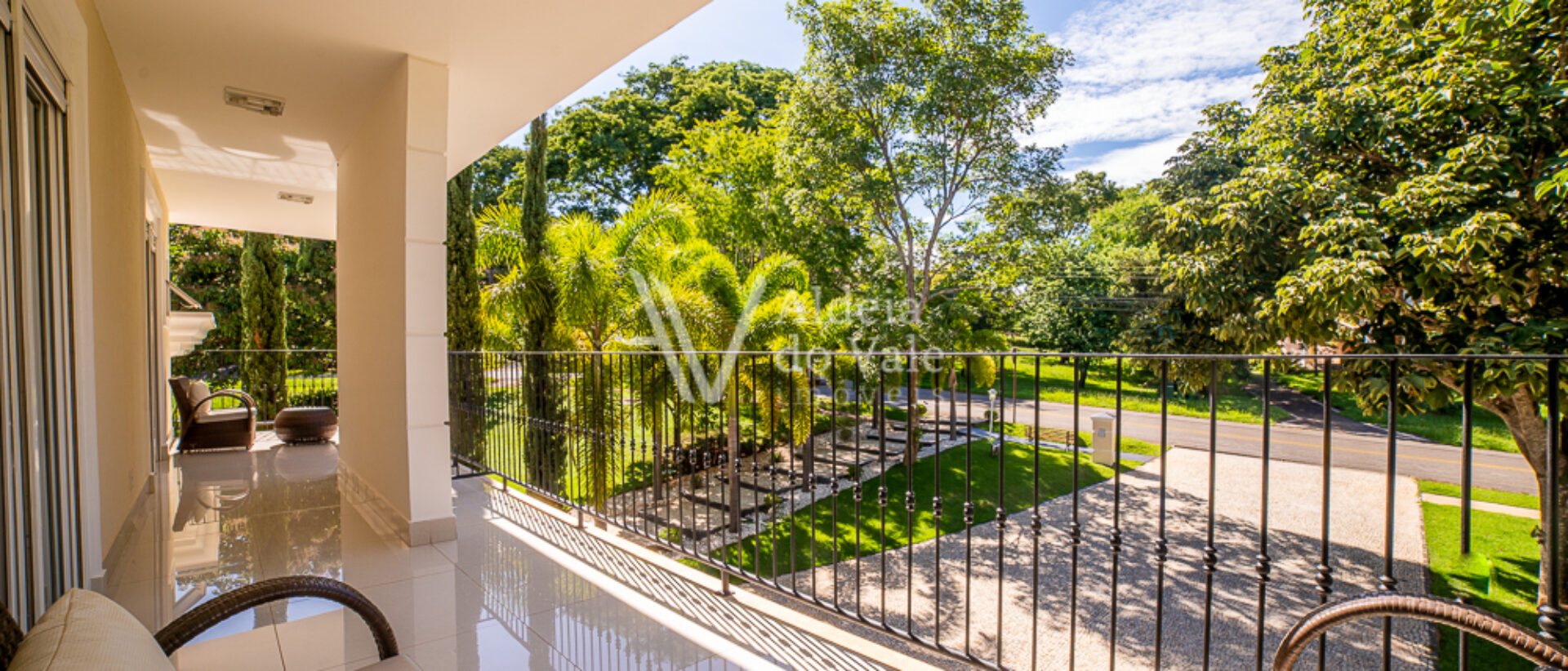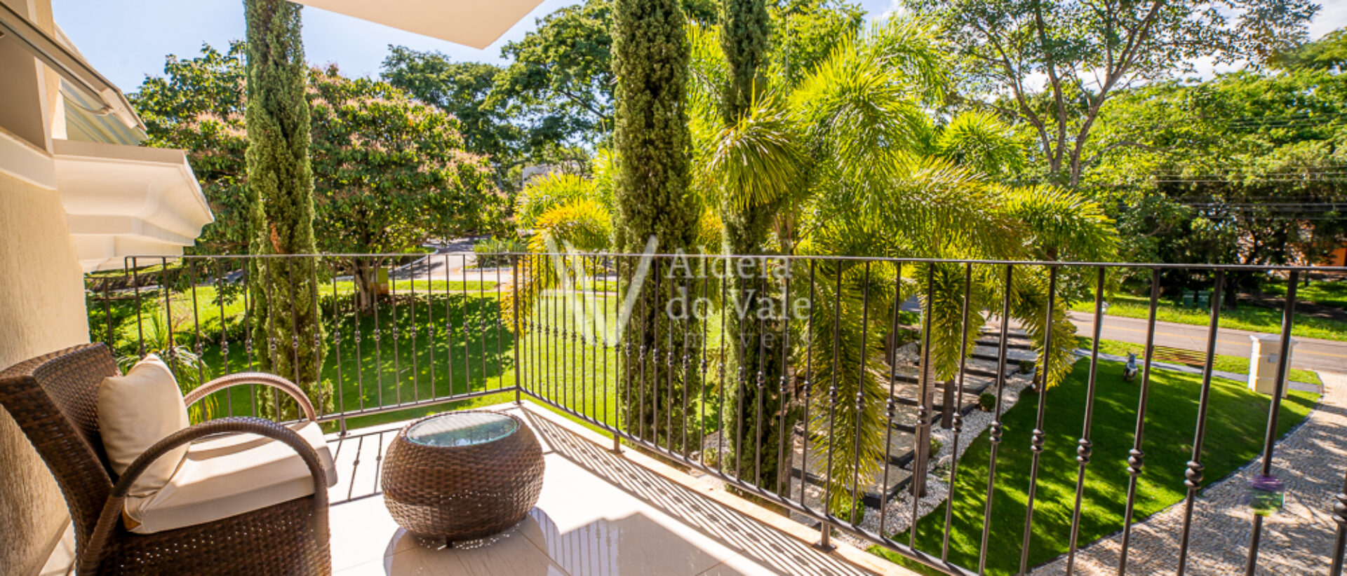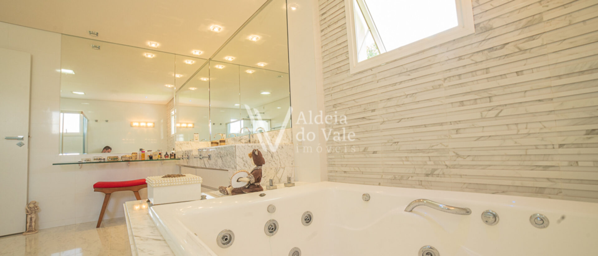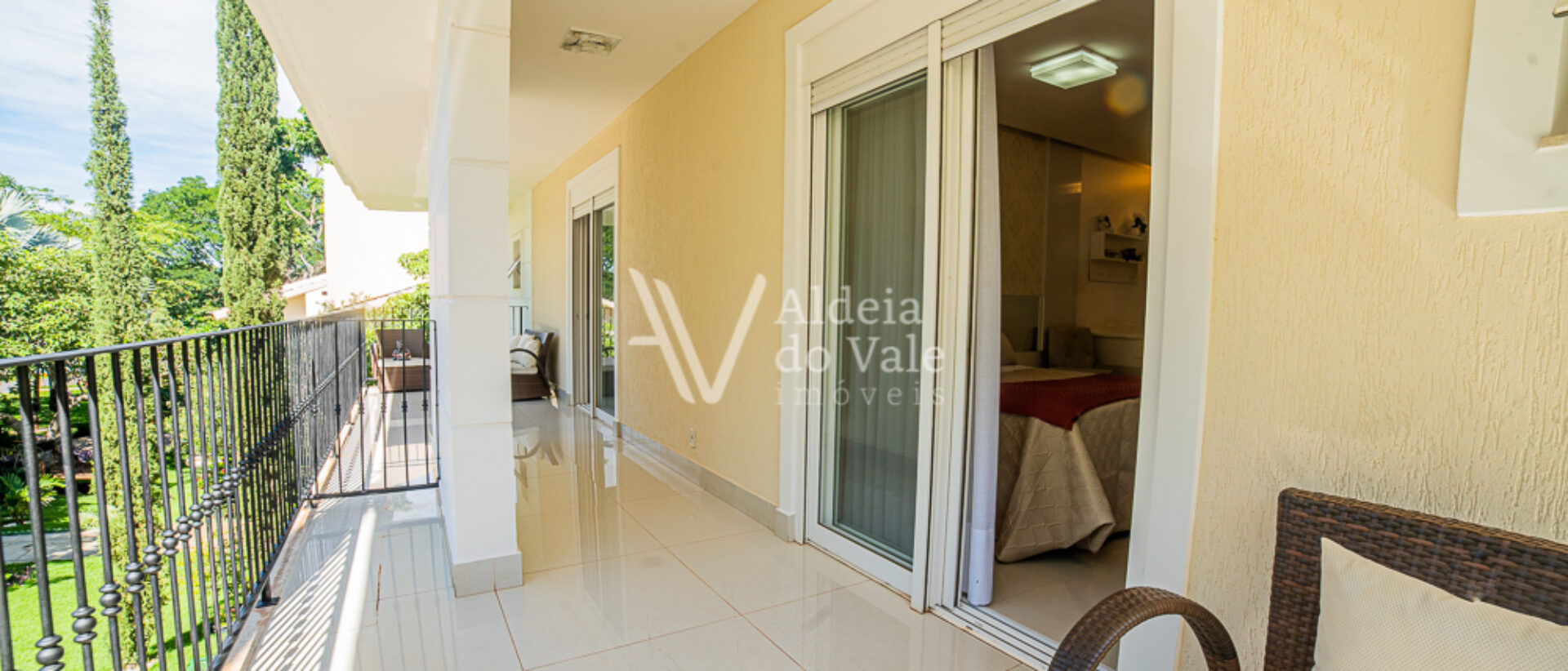 No piso superior são 5 suítes amplas completíssimas em armários e climatizadas, a do casal com closet e banheira de hidro e acabamentos em mármore. Sala íntima com varanda superior.