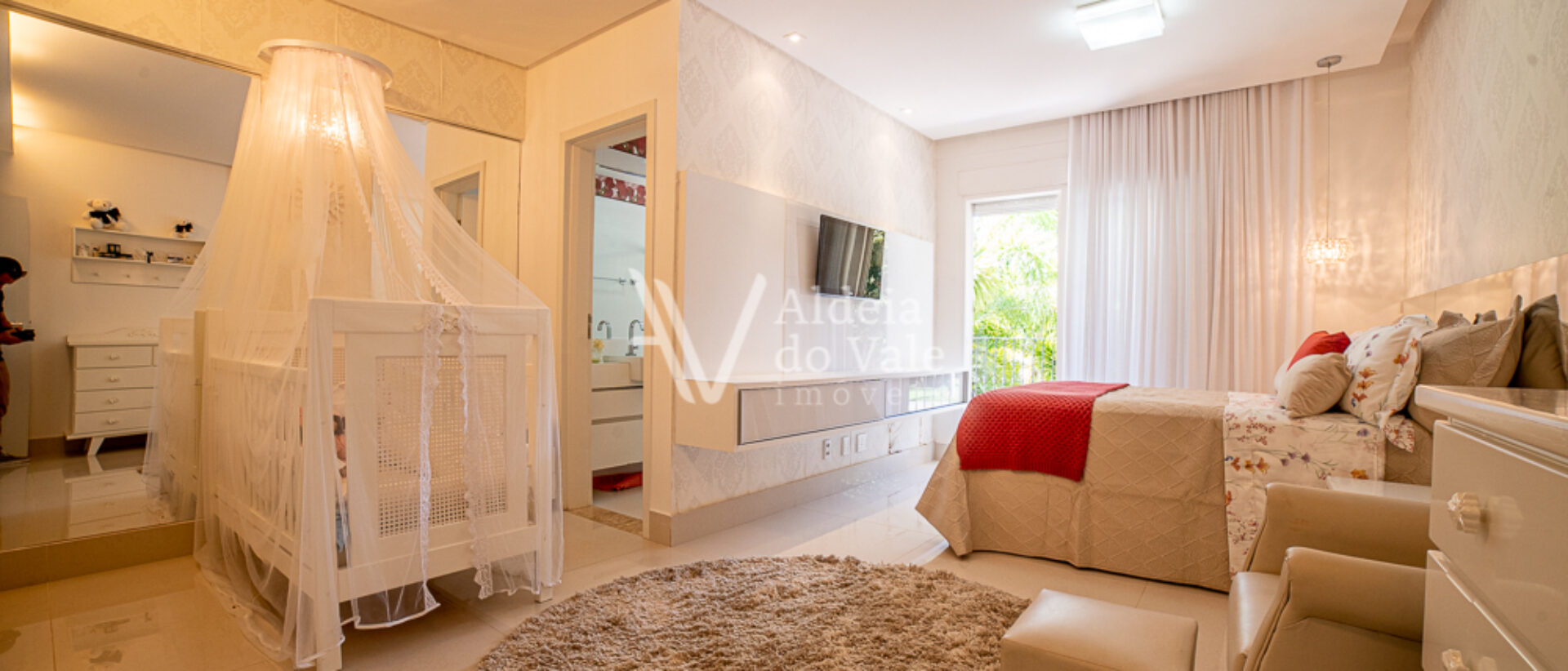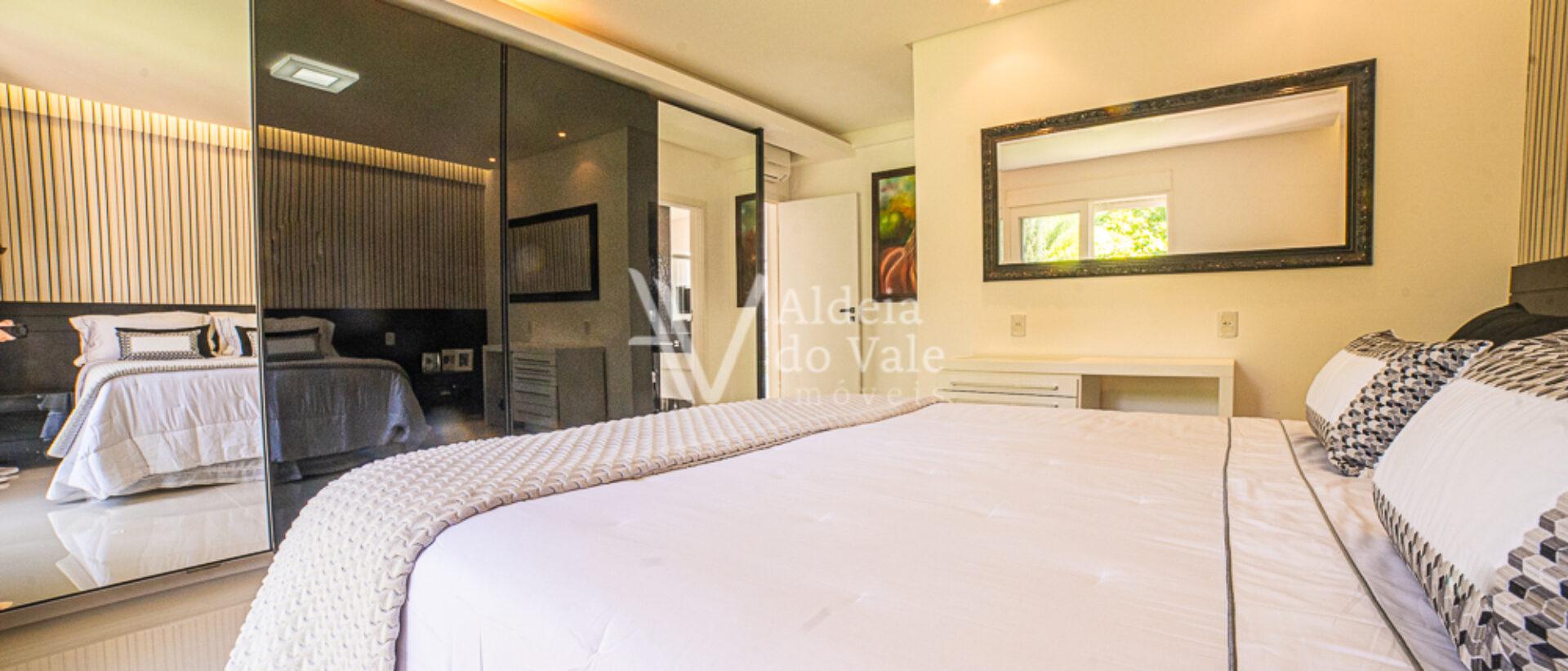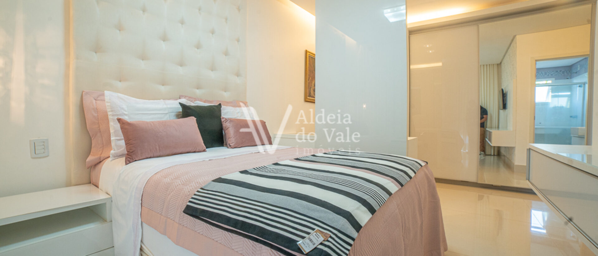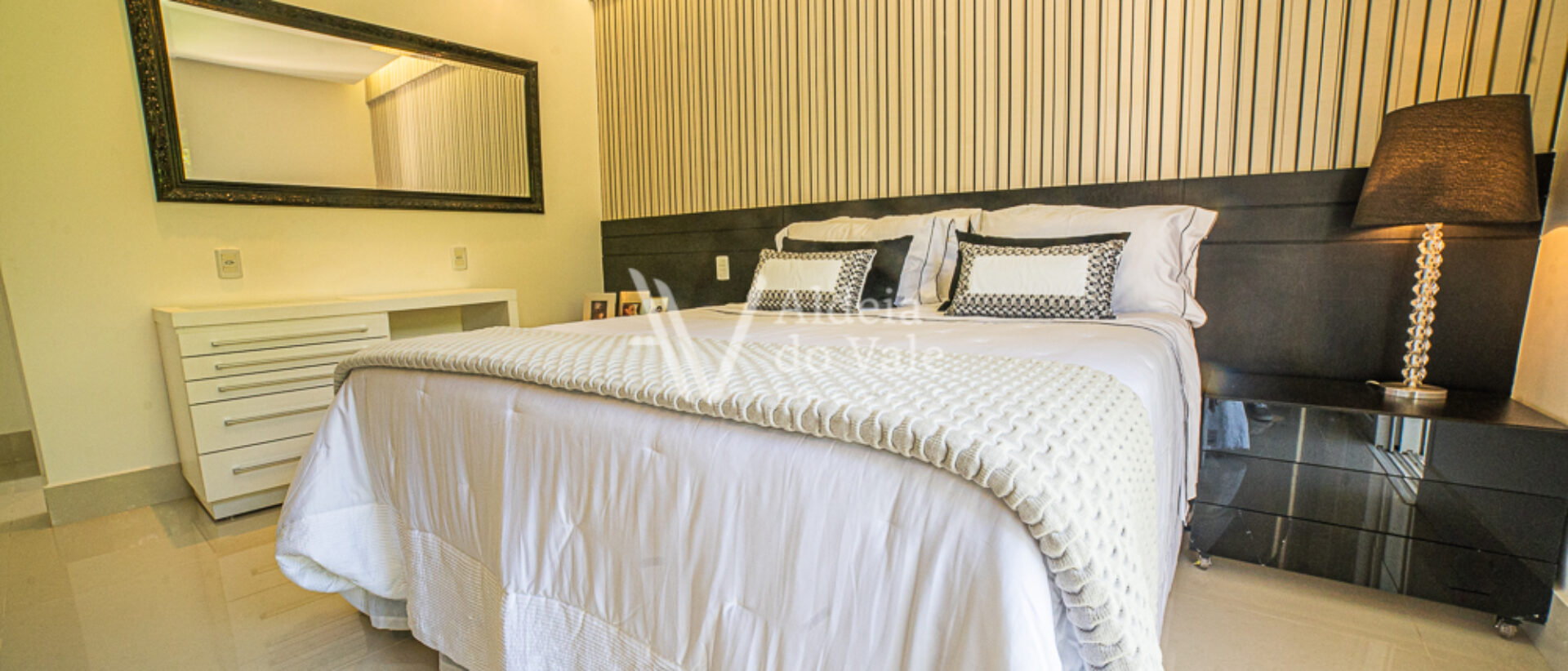 Um destaque deste vídeo é a linda produção das camas das suítes, um mimo realizado com todo o carinho pela loja “Moreira e Glorinha”, a harmonia e aconchego perfeitos na integração das roupas de cama com os quartos, esse mimo está disponível para você fazer sua própria harmonização em sua casa, é só clicar no QR Code disponível no vídeo durante a apresentação das suítes no piso superior e agendar uma demonstração.