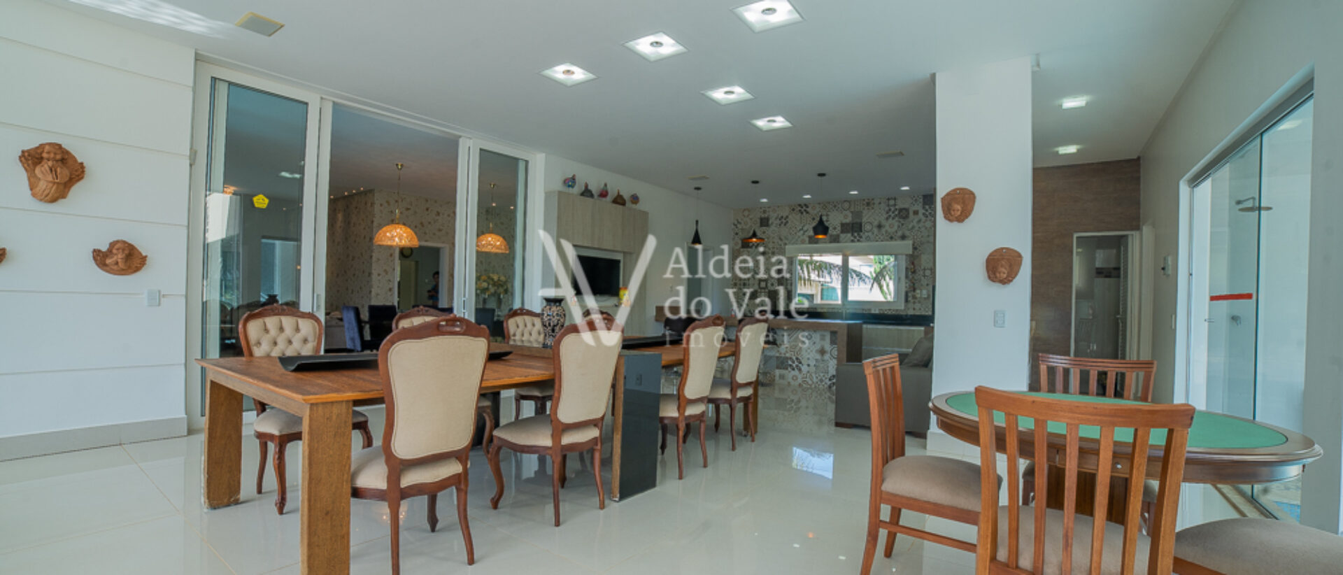 No piso térreo a casa possui um escritório, lavabo, salas de estar, jantar e Home Theater, cozinha, louceiro, DCE, varanda ampla com área gourmet integrada com a piscina, sauna e SPA. Completa em paisagismo e com um salão de lazer com 200m² que comporta grandes reuniões.