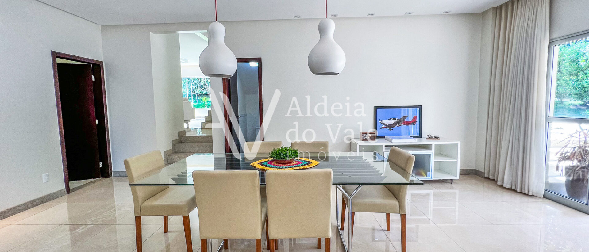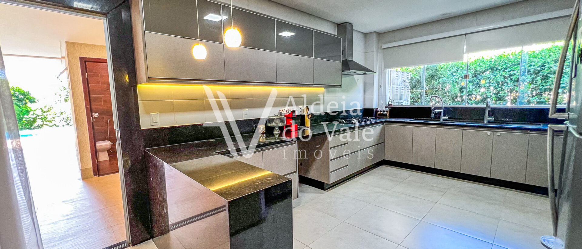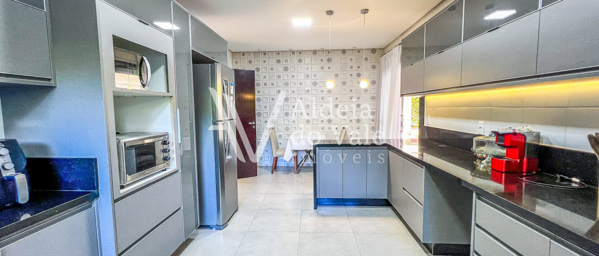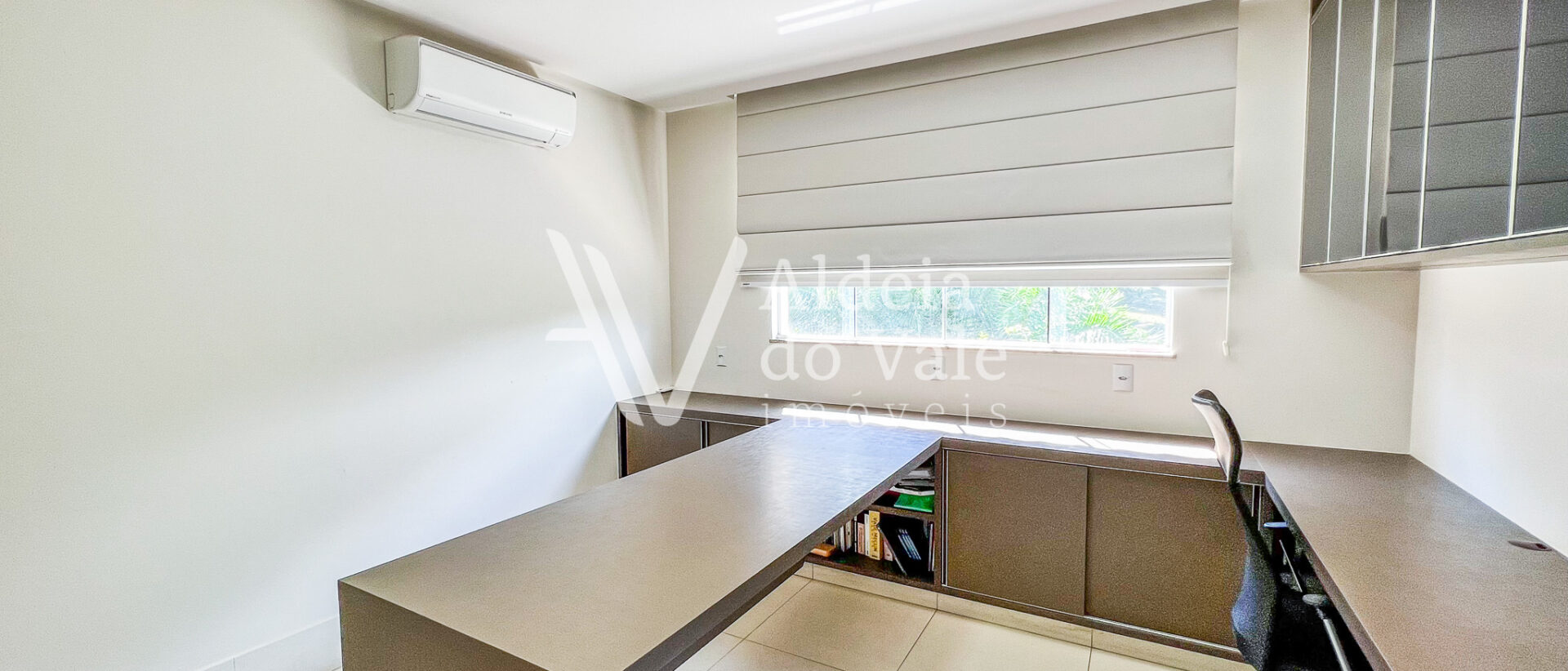 Possui copa no andar superior, escritório, sala de TV e jantar, e garagem coberta com 3 vagas.