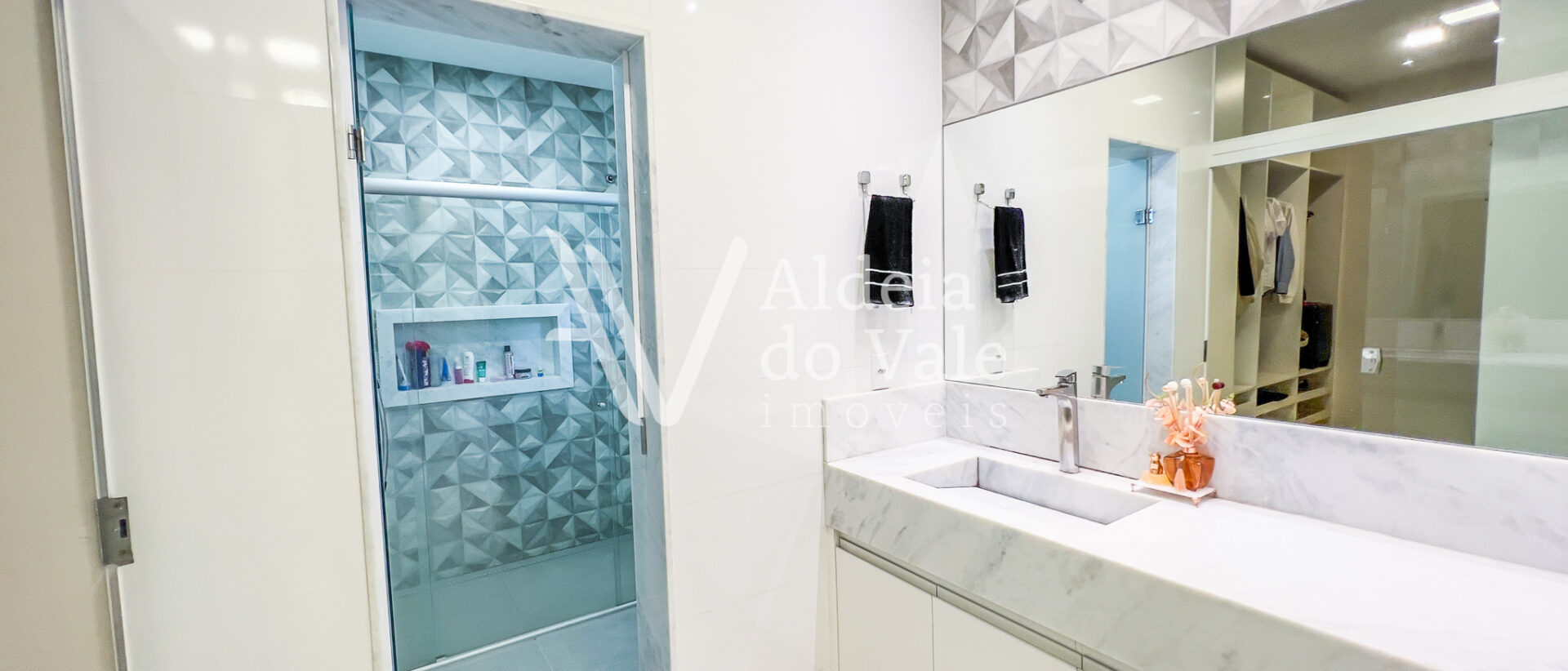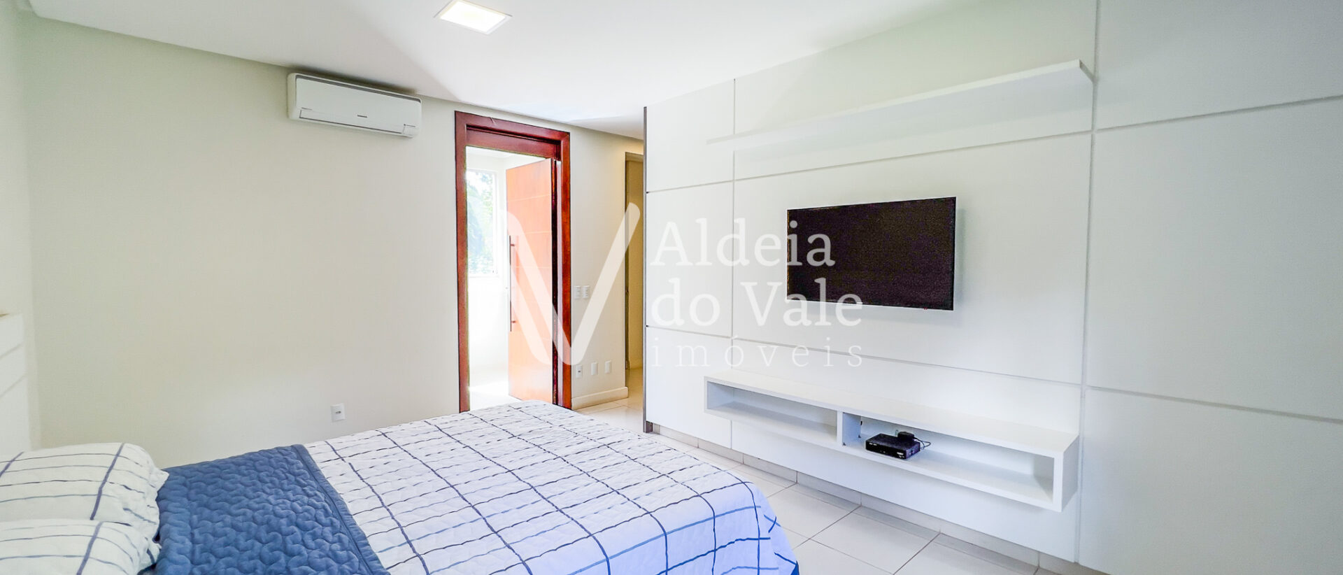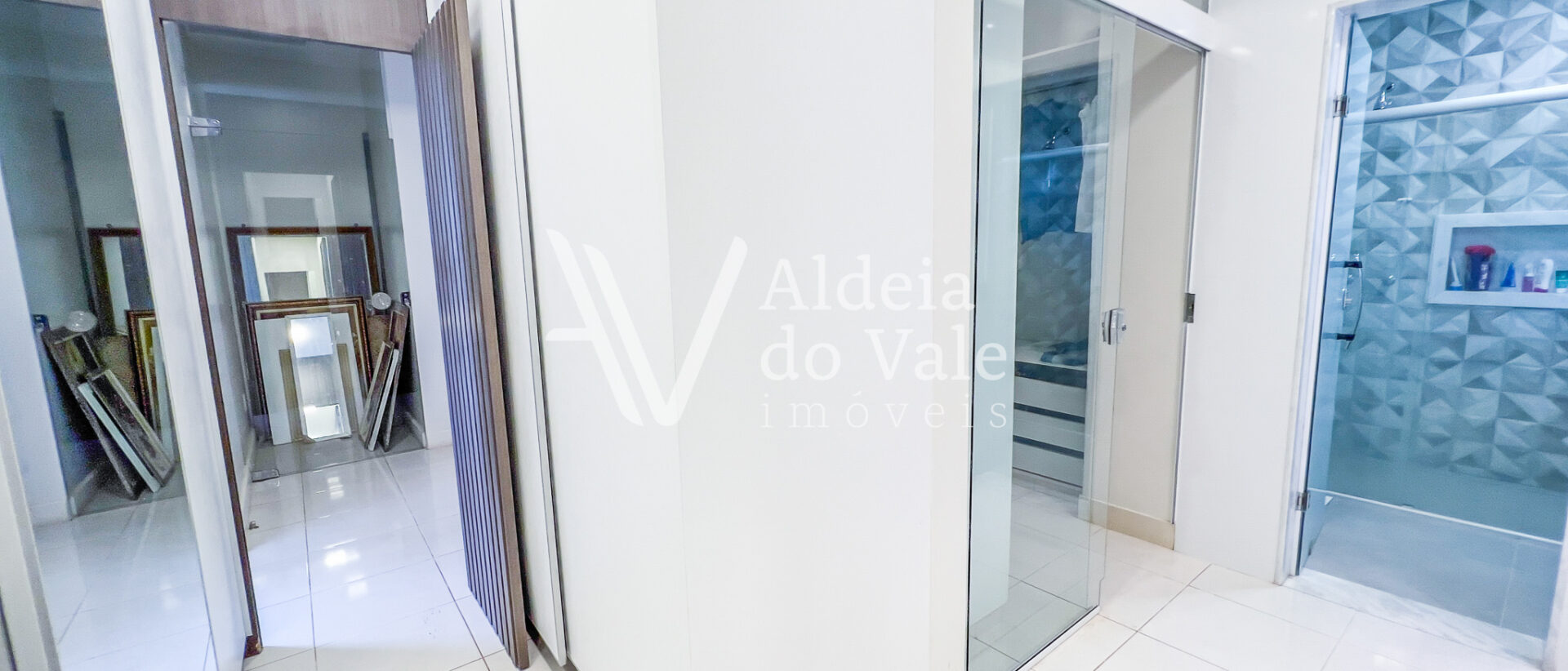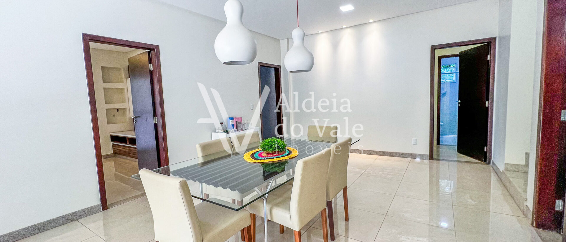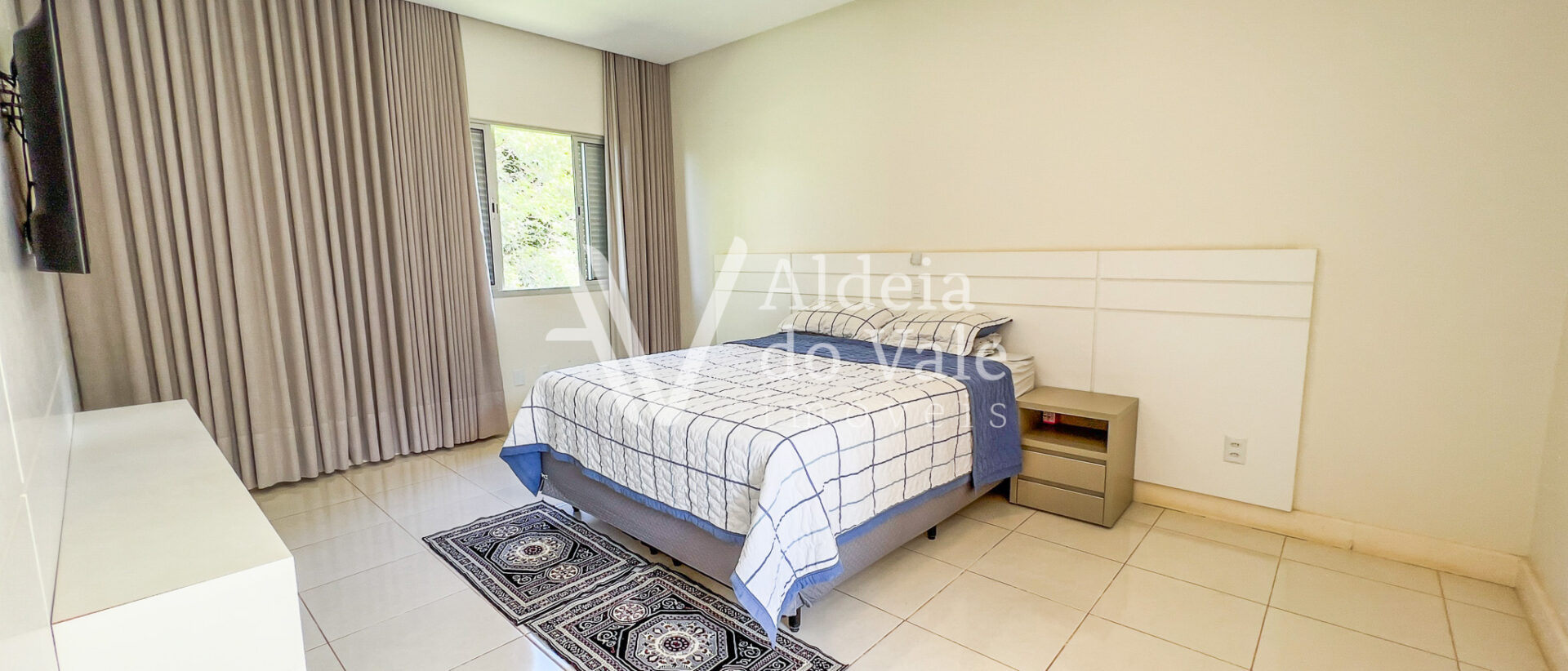 A casa possui 4 suítes, sendo uma suíte master com closet duplo e uma suíte no térreo. Todos os quartos têm vista com paisagem e amplos armários.