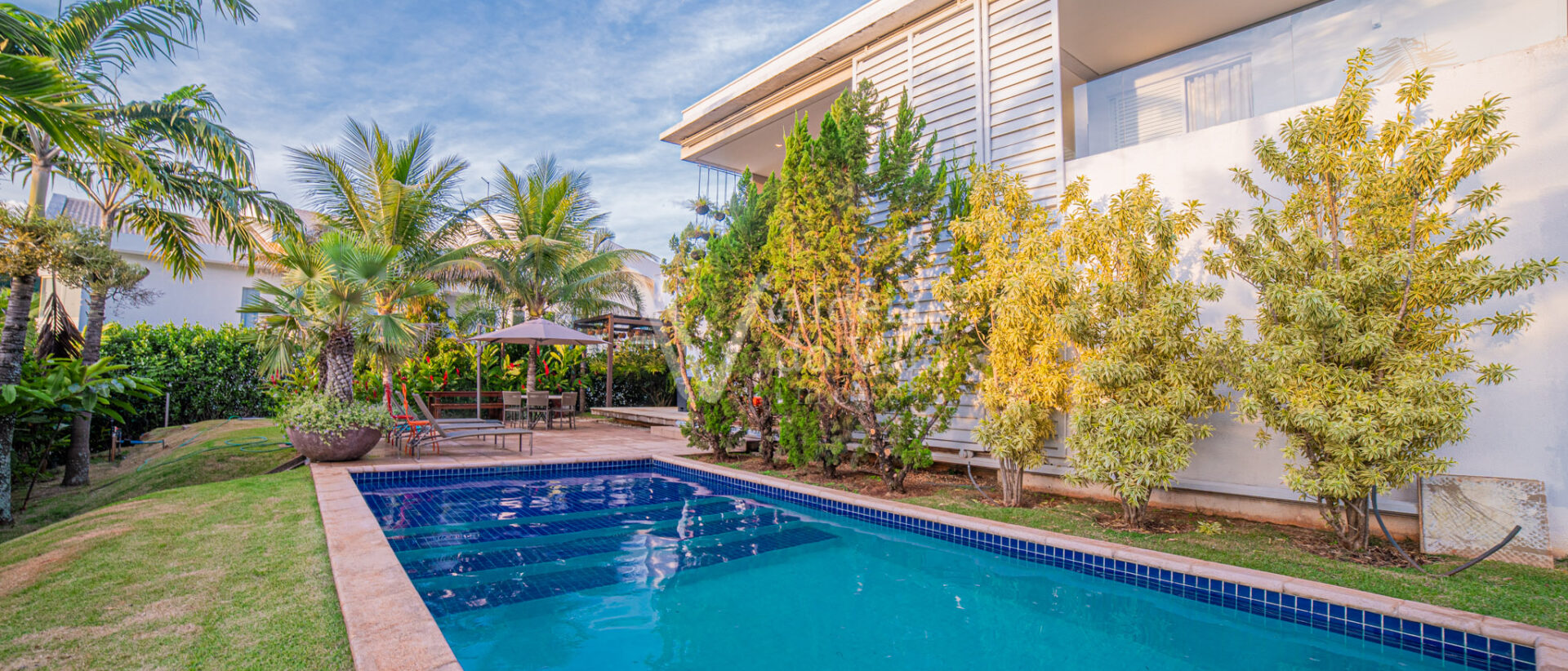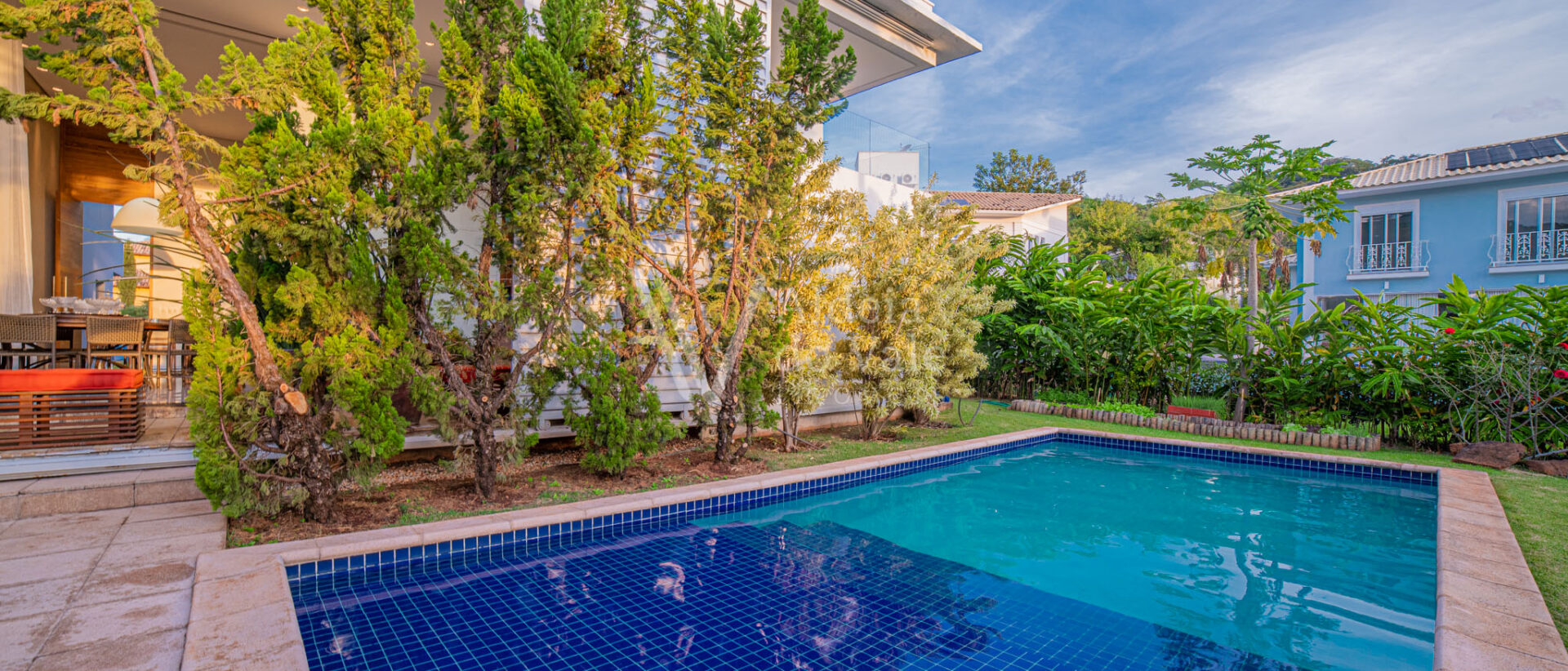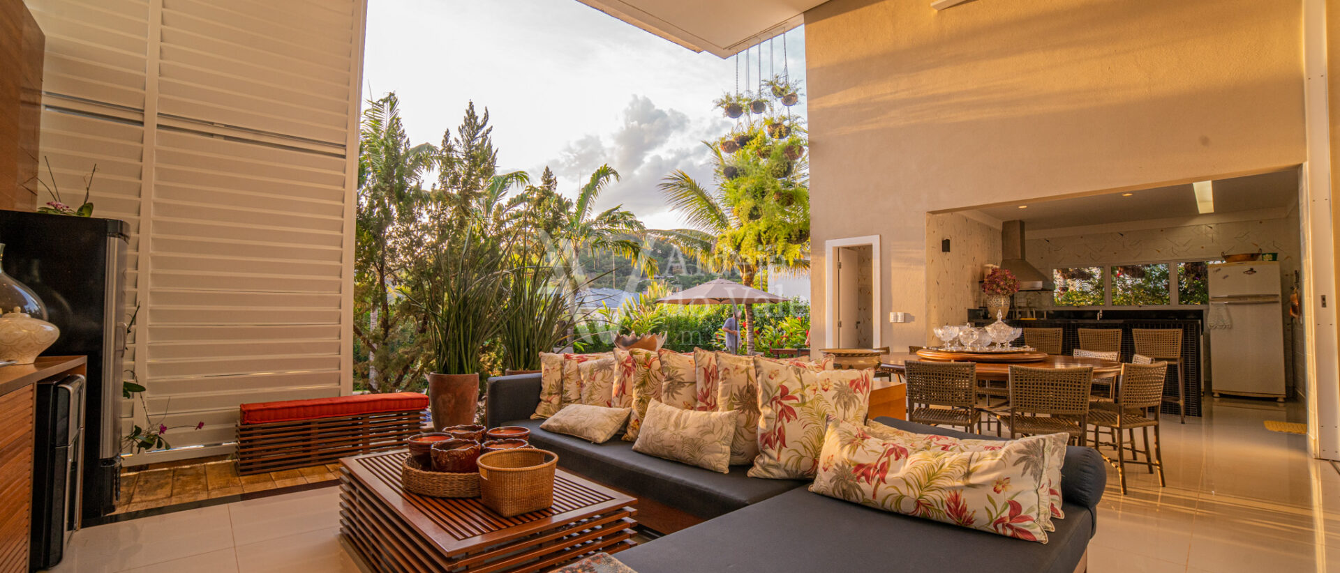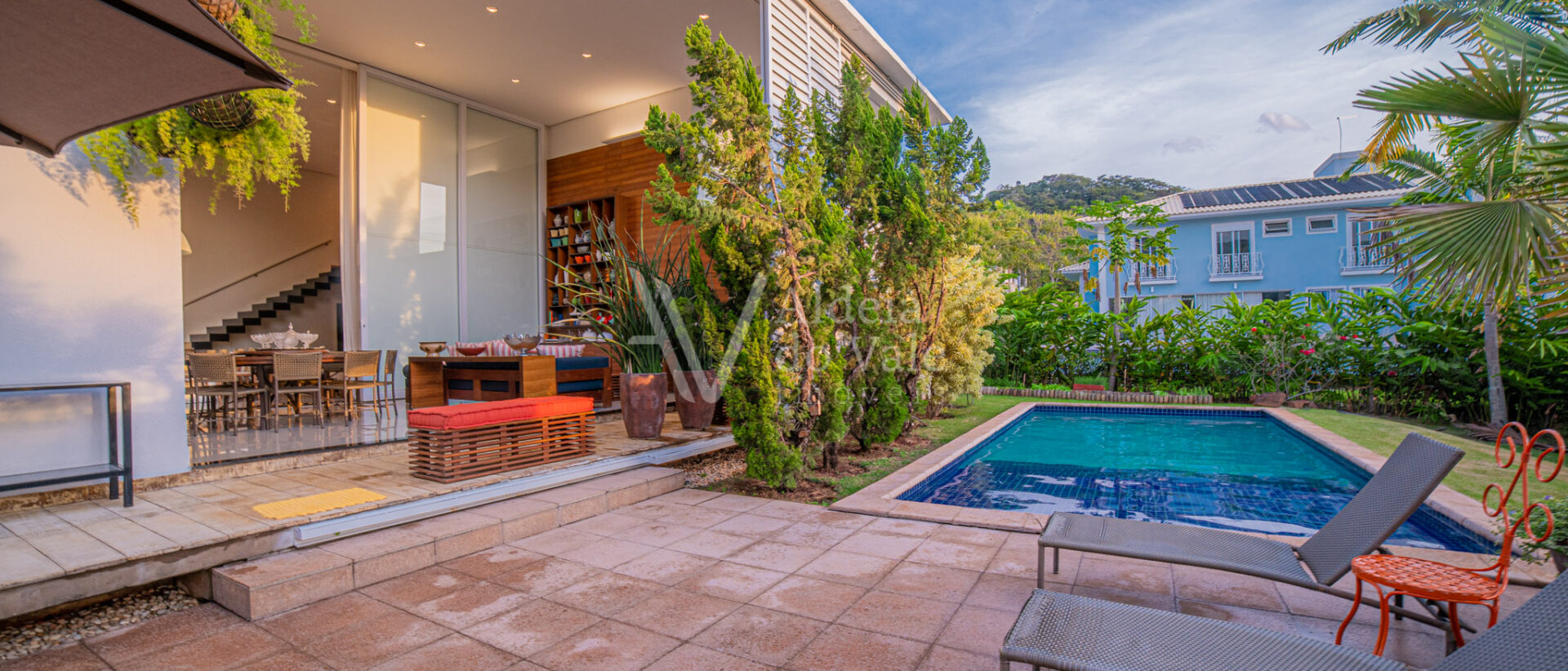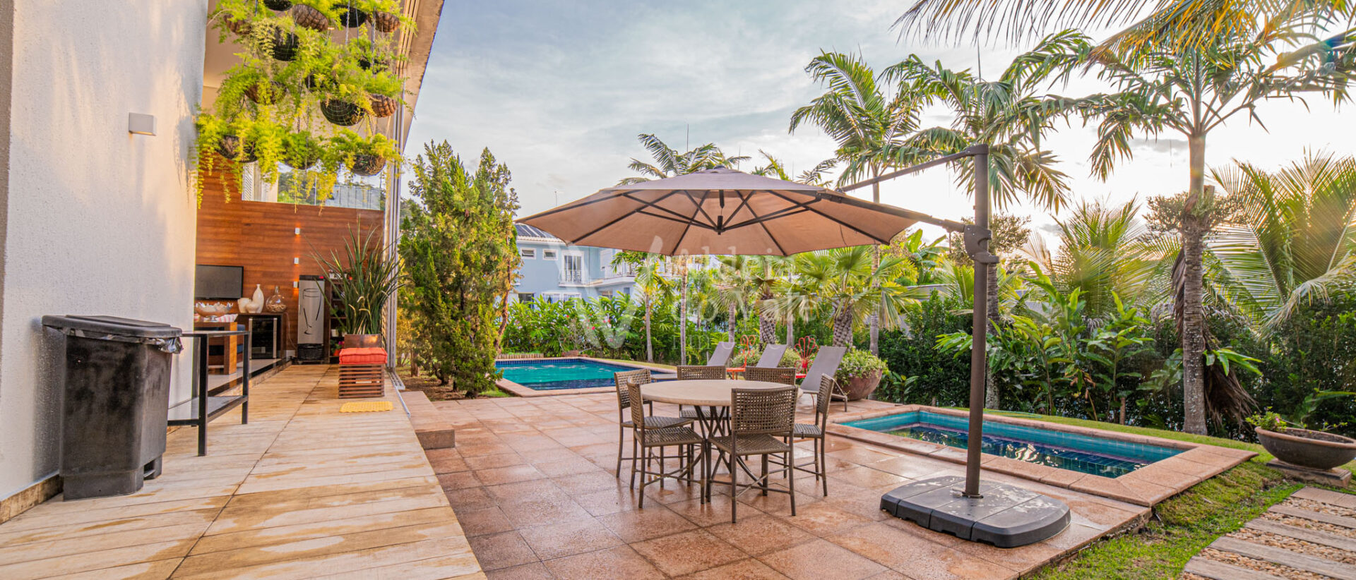 Área de lazer integrando a sala com varanda de estar que possui um belo painel amadeirado e fechamento em brises metálicos, espaço gourmet com Churrasqueira, Lavabo, Piscina aquecida, Spa com hidro, pergolado, horta, belo paisagismo, poço artesiano, irrigação automática, garagem coberta para 3 carros.