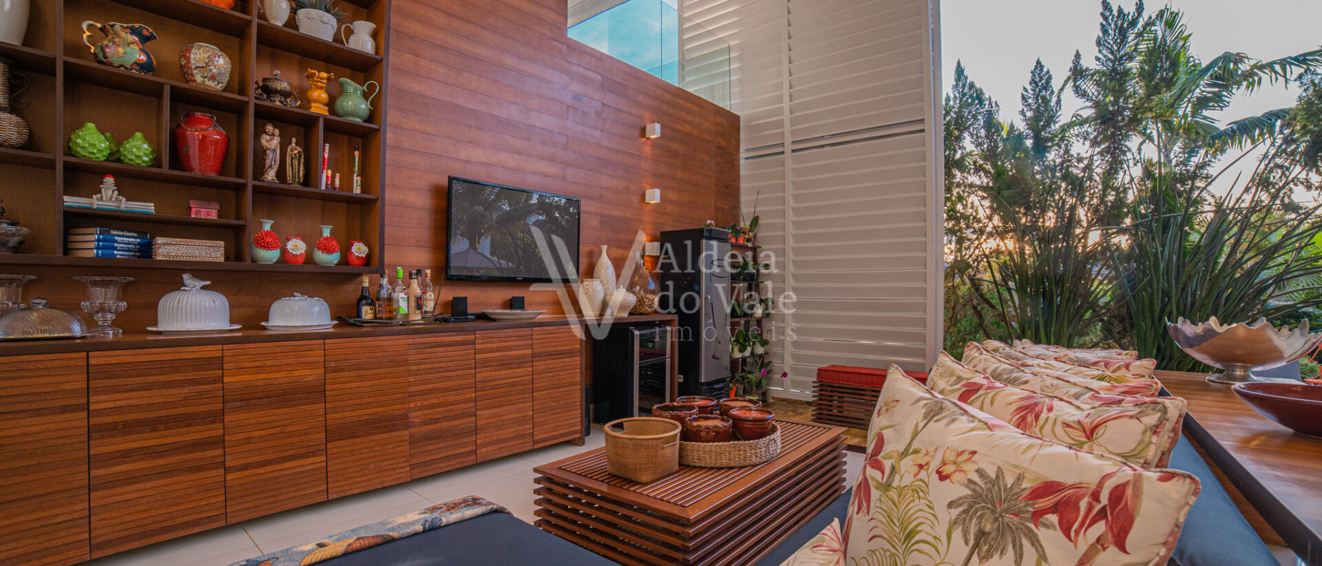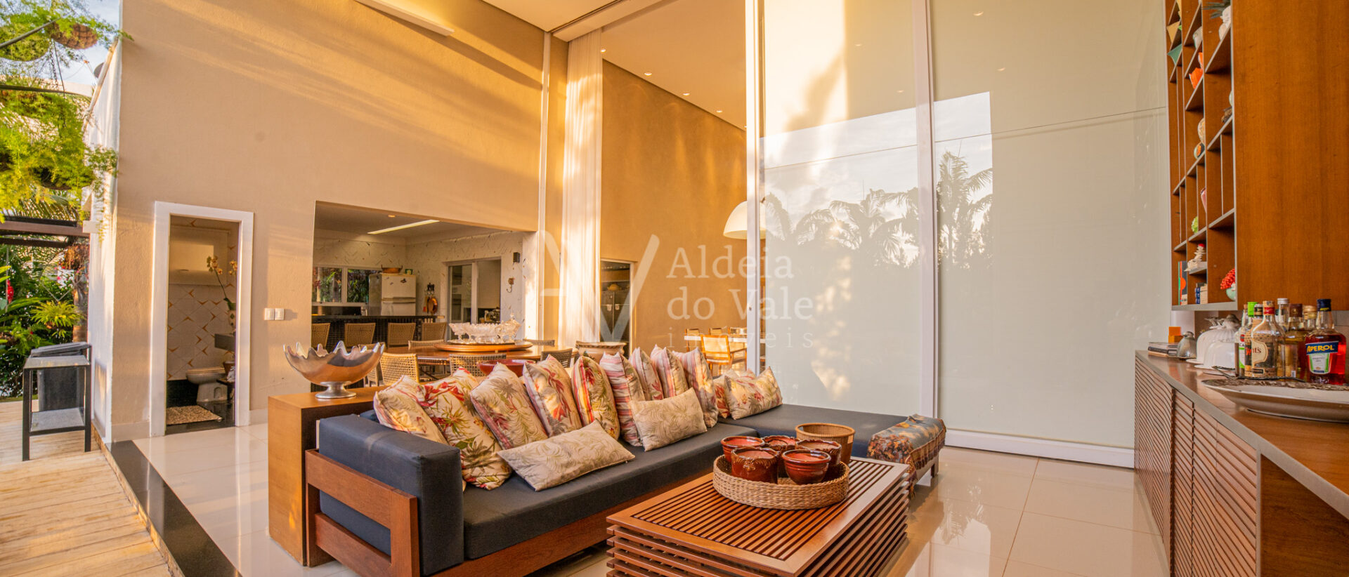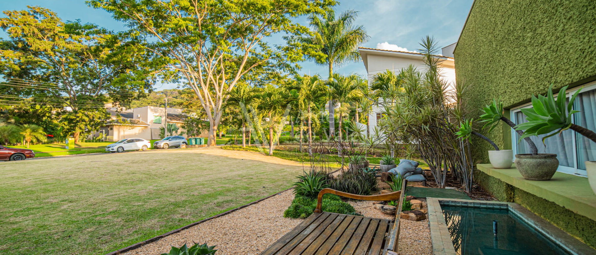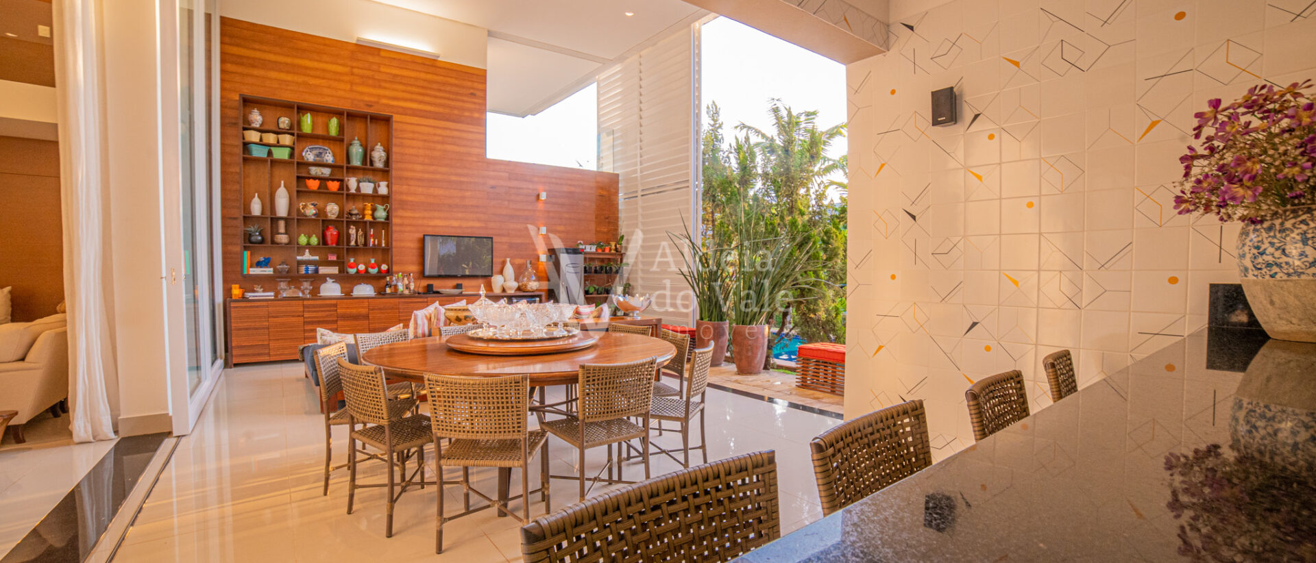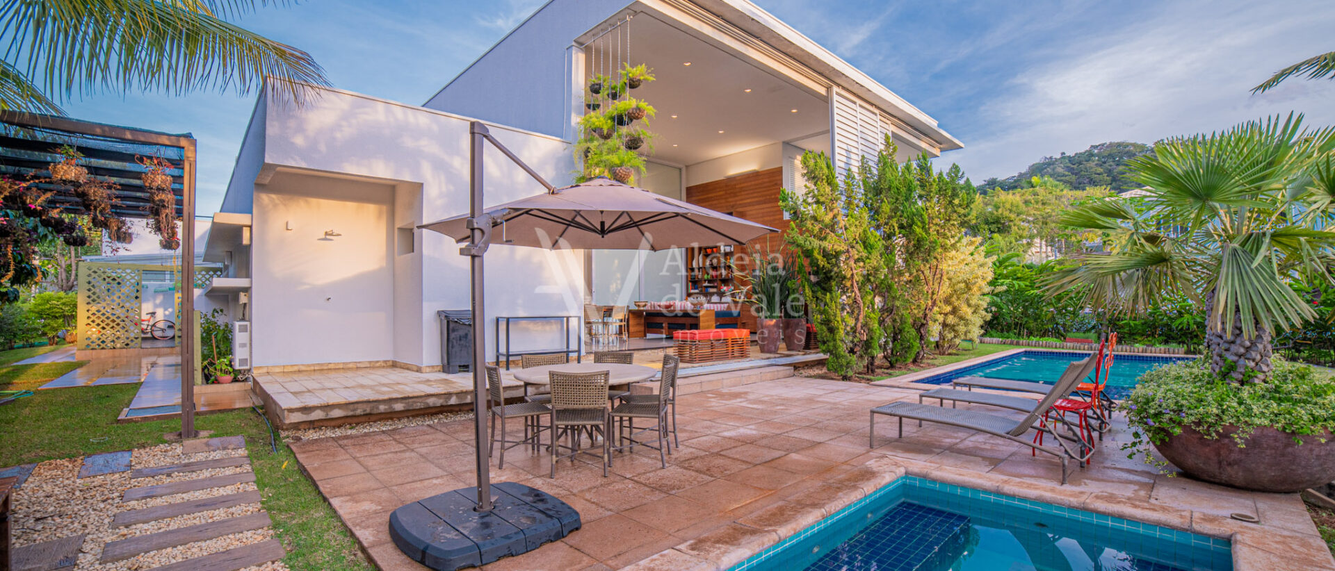 Área de lazer integrando a sala com varanda de estar que possui um belo painel amadeirado e fechamento em brises metálicos, espaço gourmet com Churrasqueira, Lavabo, Piscina aquecida, Spa com hidro, pergolado, horta, belo paisagismo, poço artesiano, irrigação automática, garagem coberta para 3 carros.