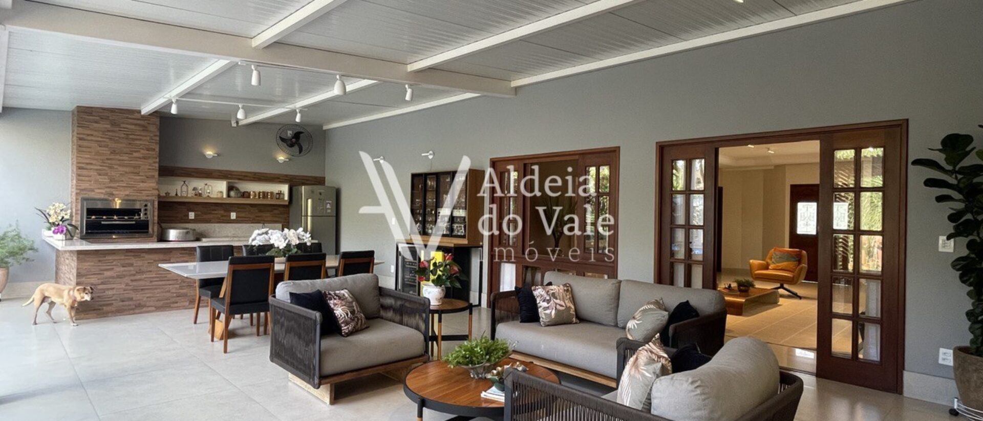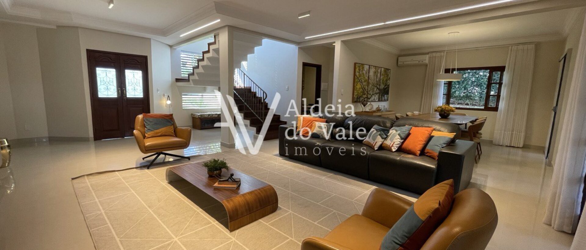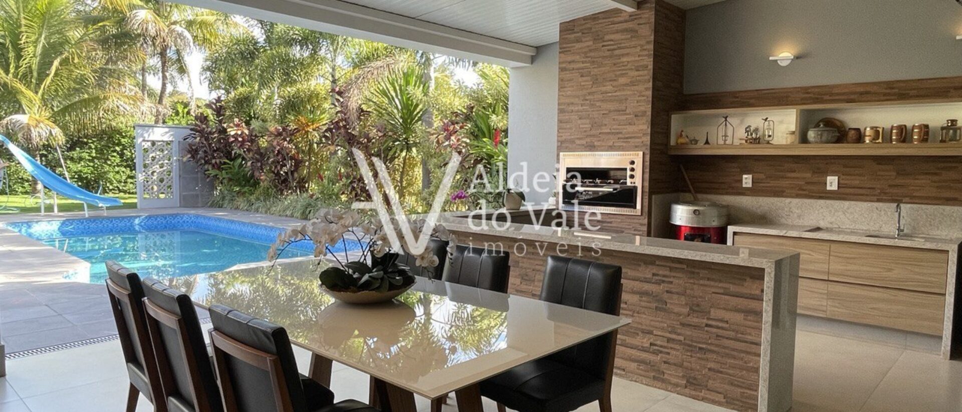 Pavimento térreo: Sala de estar, sala de jantar, lavabo, escritório, cozinha, área gourmet com churrasqueira, piscina, 1 suíte e 1 escritório externo.