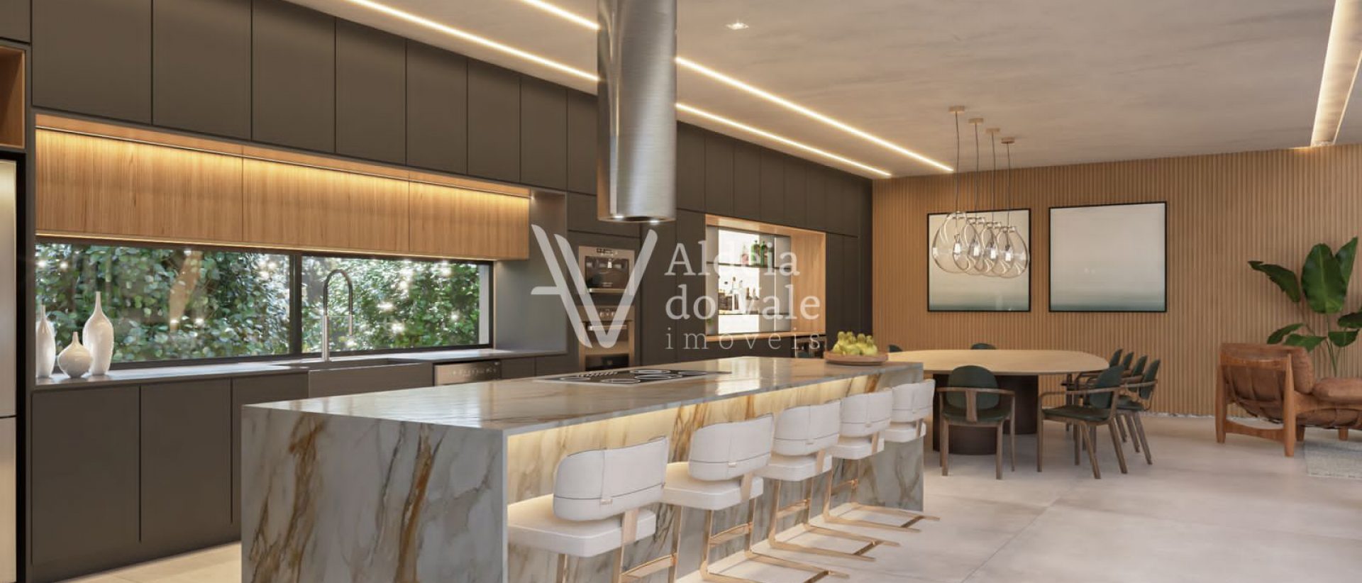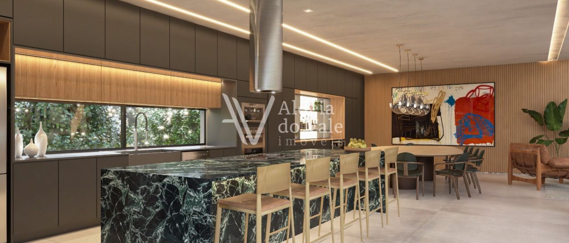 Possui cozinha Gourmet, despensa, Área de churrasqueira, Adega, Estúdio / Escritório, Área de serviço, Banheiro de serviço e vagas para 04 carros.