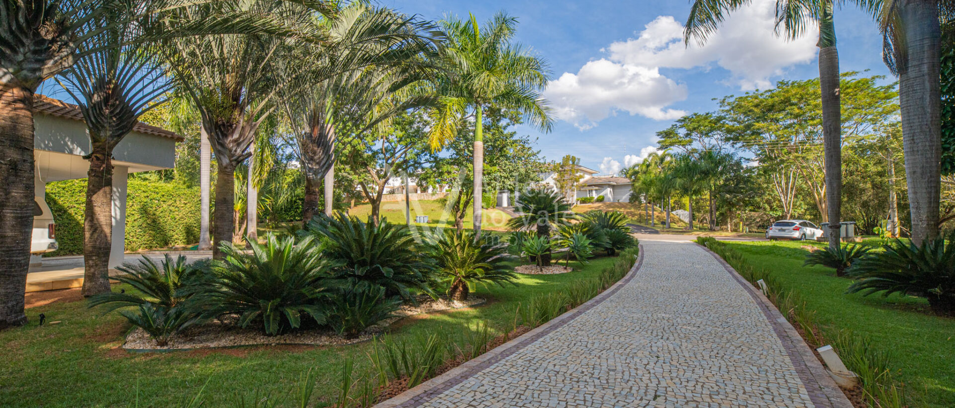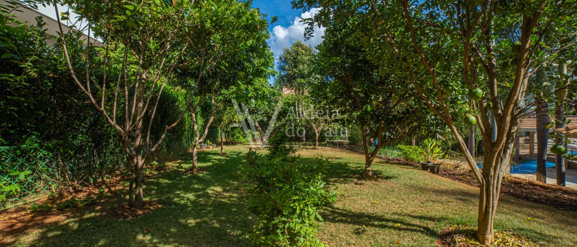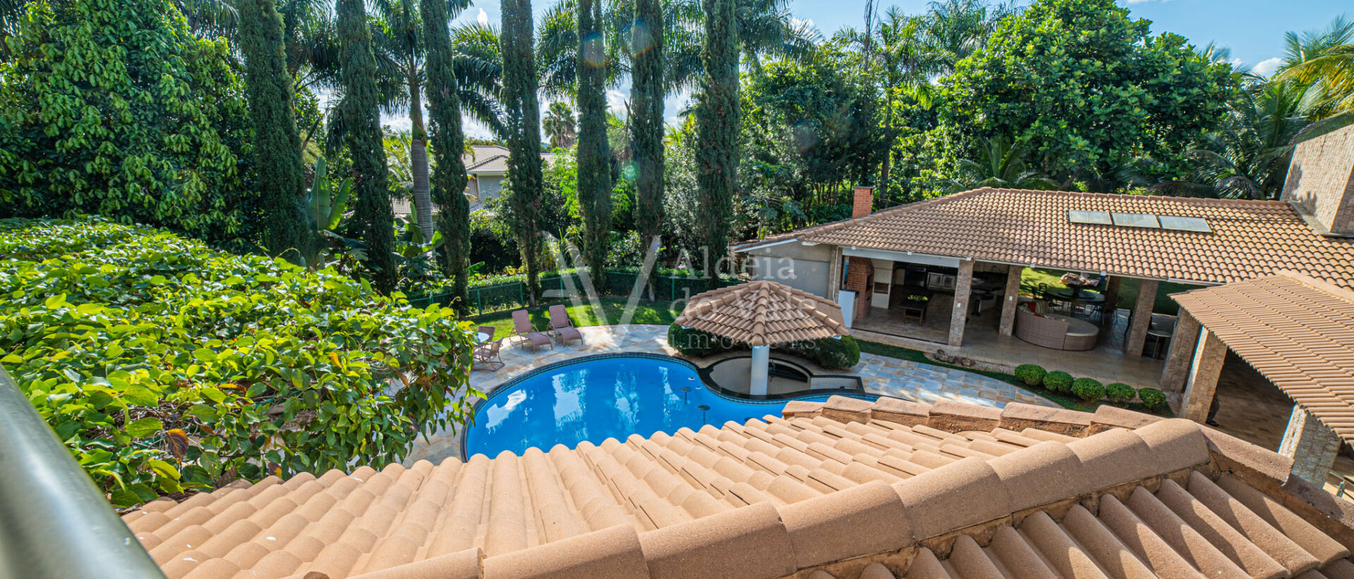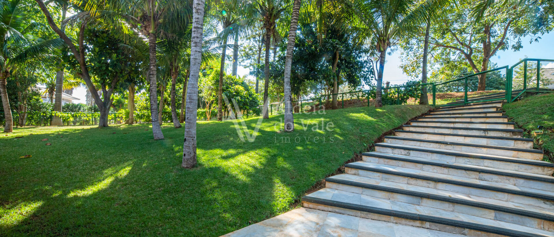 Este belo sobrado localizado em um fundo de vale com lagos é integrado na natureza. Cercado por palmeiras imperiais possui um pomar completo com aproximadamente 50 espécies frutíferas e horta.