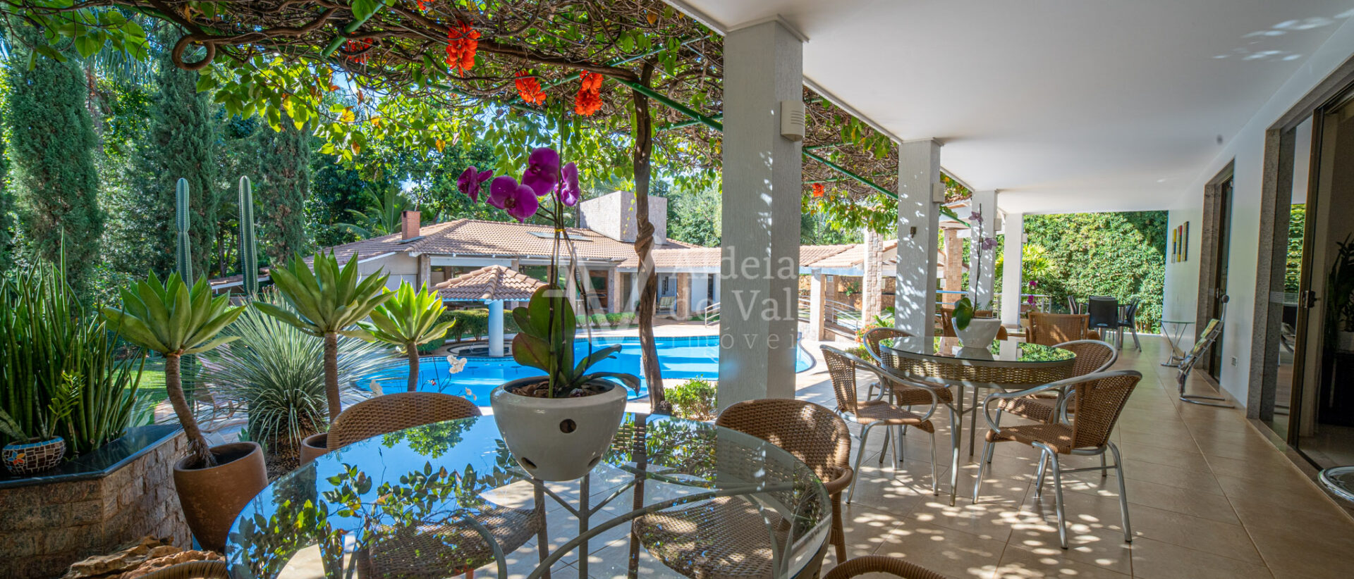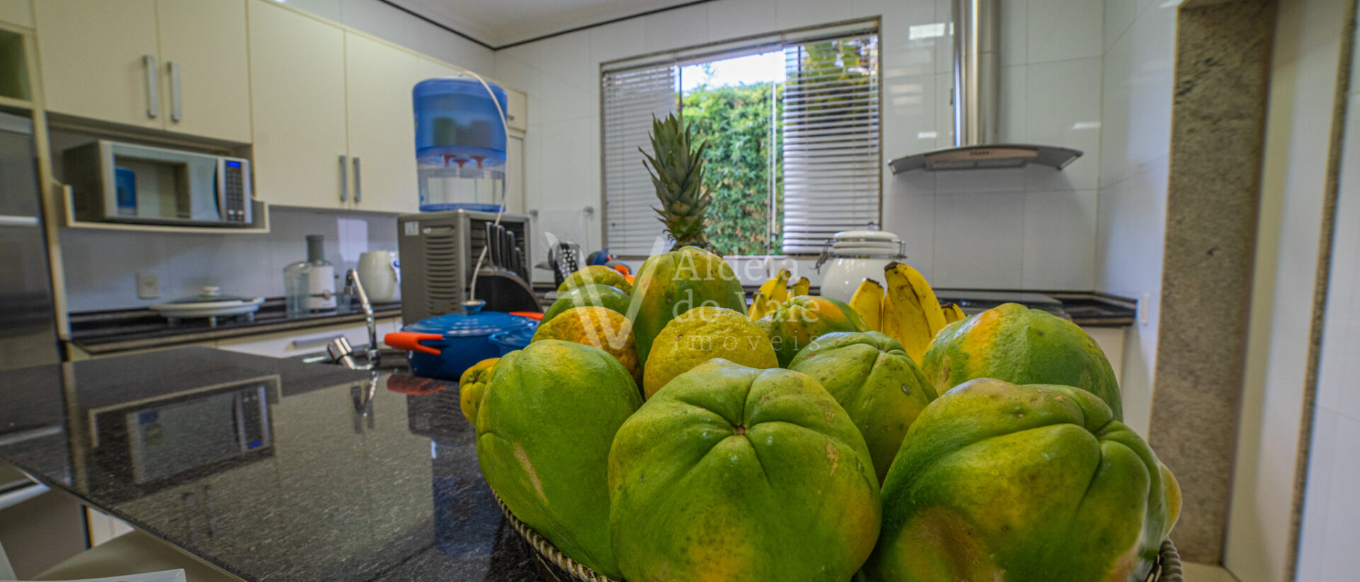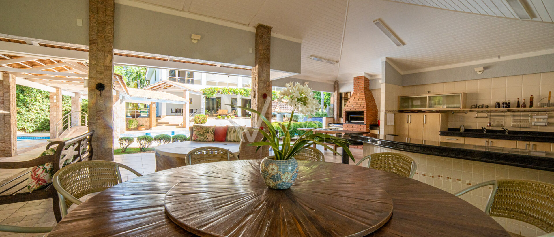 Este belo sobrado localizado em um fundo de vale com lagos é integrado na natureza. Cercado por palmeiras imperiais possui um pomar completo com aproximadamente 50 espécies frutíferas e horta.