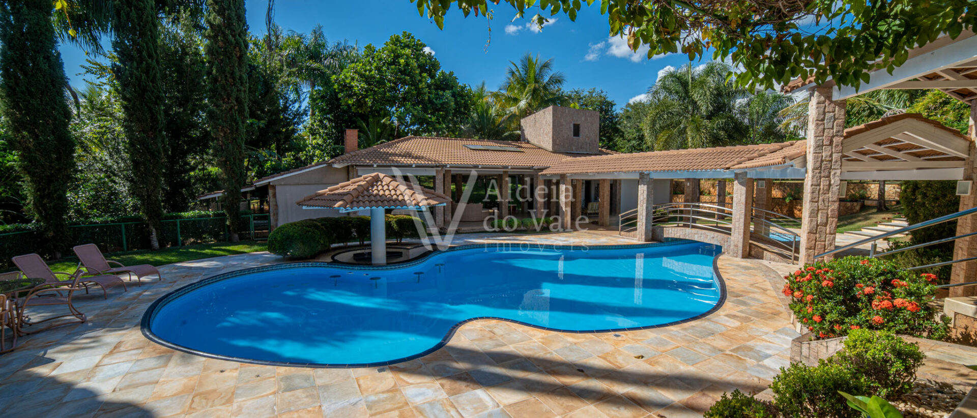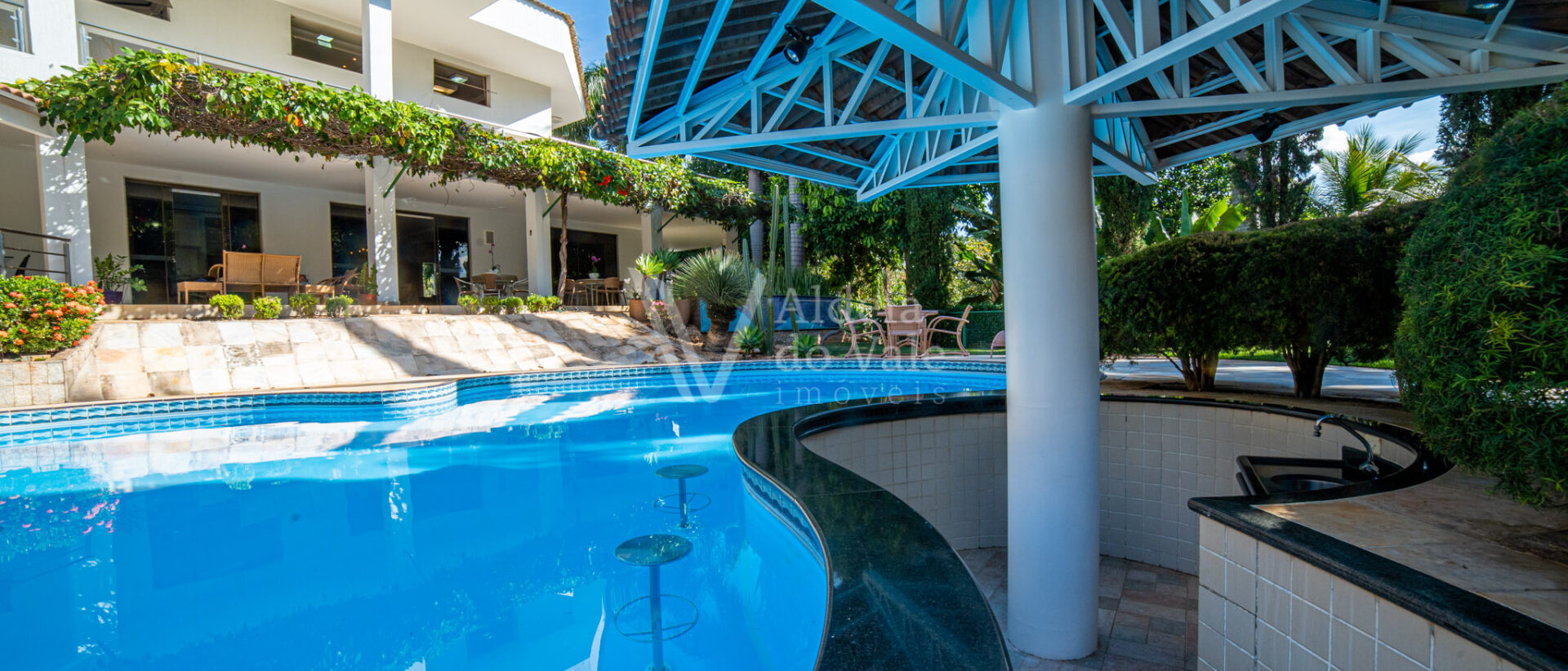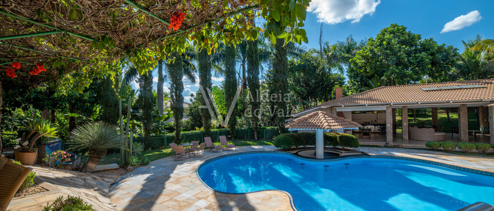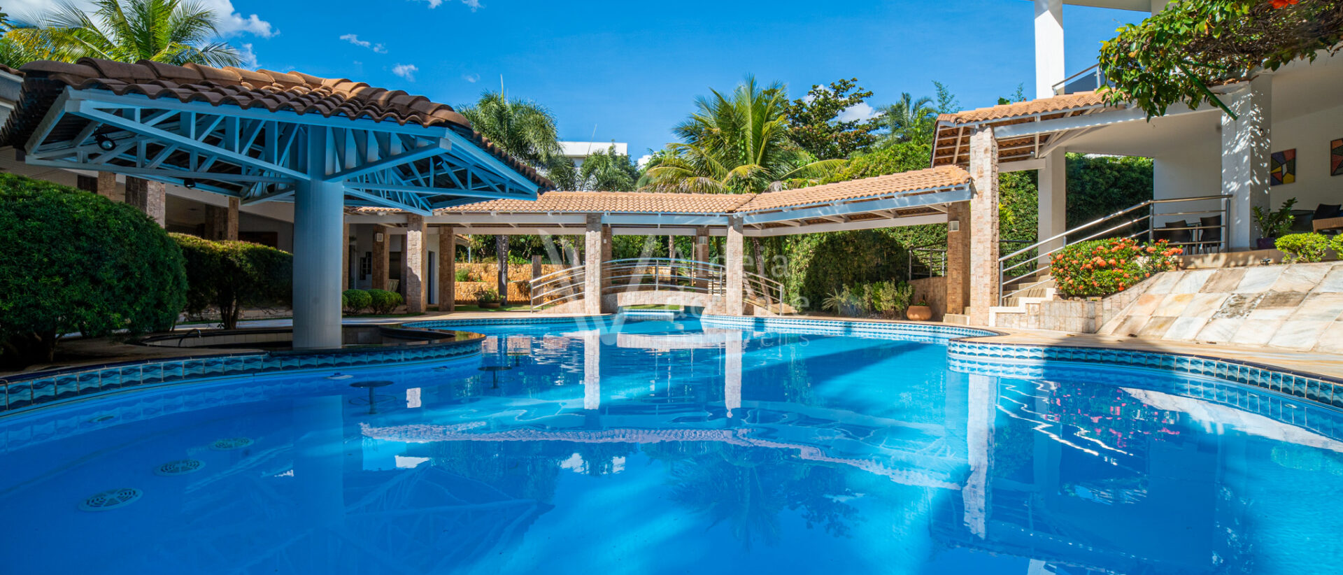 Área de lazer exuberante com piscina em formato personalizado, pergolado, bar molhado, espaço gourmet com cozinha, balcão frigorífico, bancada em granito, dois banheiros, sauna, sala de jogos, escaninho.