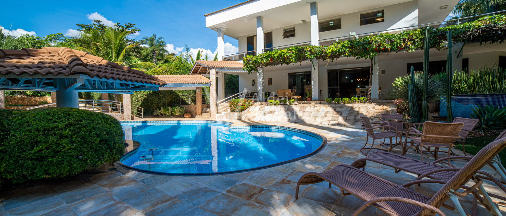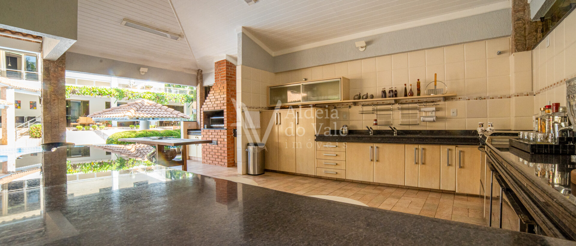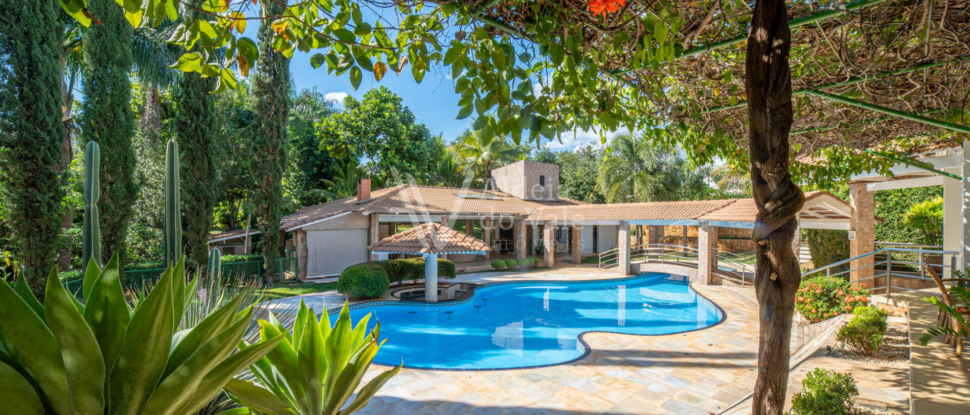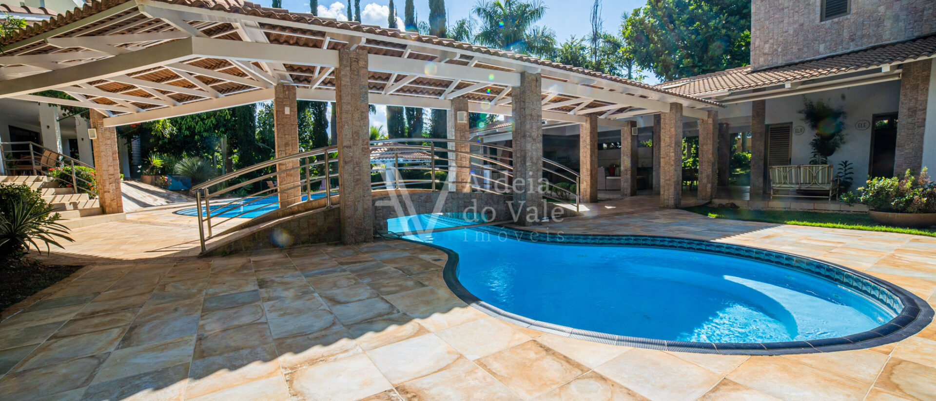 Área de lazer exuberante com piscina em formato personalizado, pergolado, bar molhado, espaço gourmet com cozinha, balcão frigorífico, bancada em granito, dois banheiros, sauna, sala de jogos, escaninho.