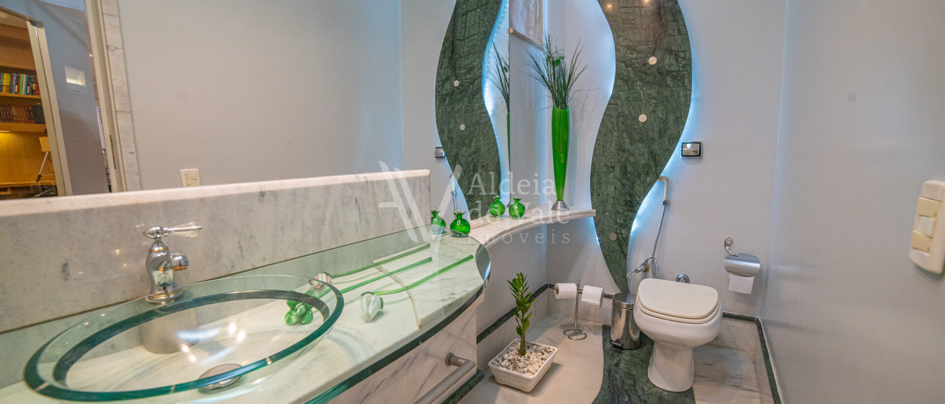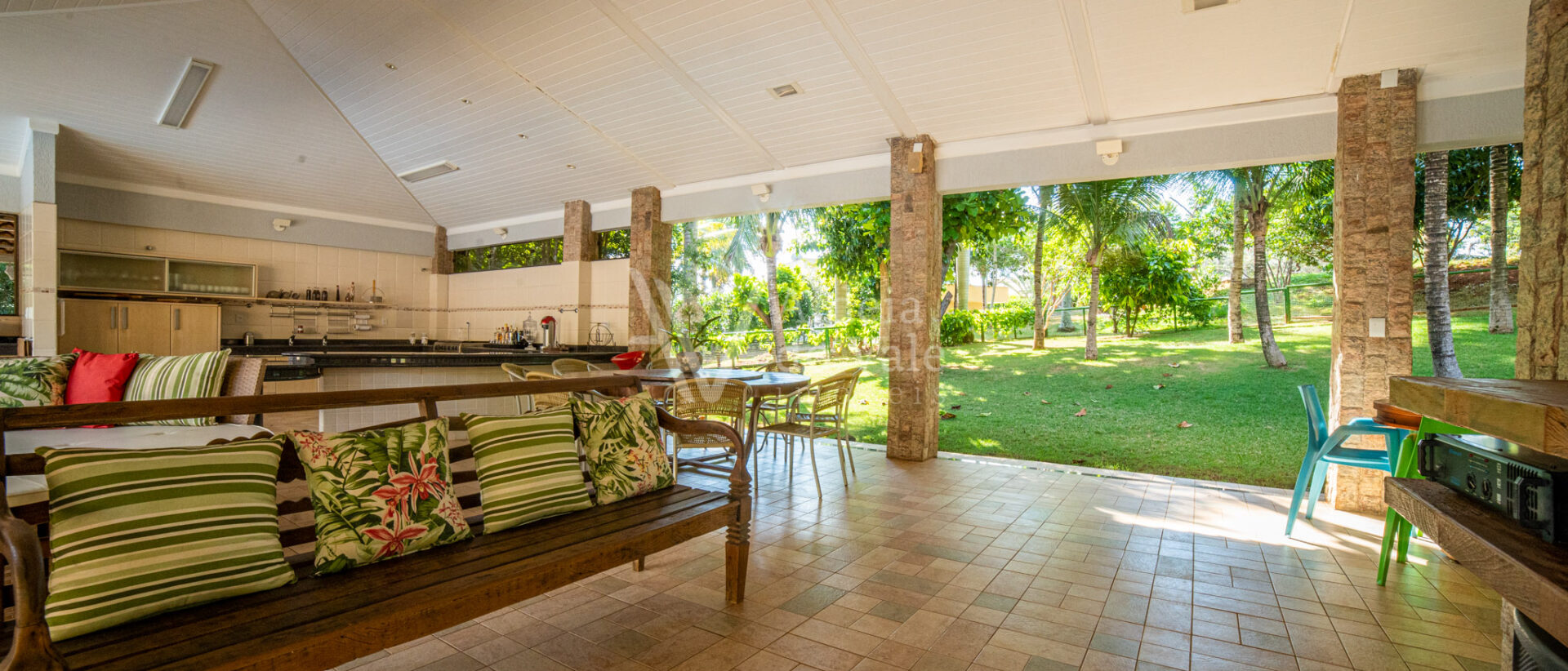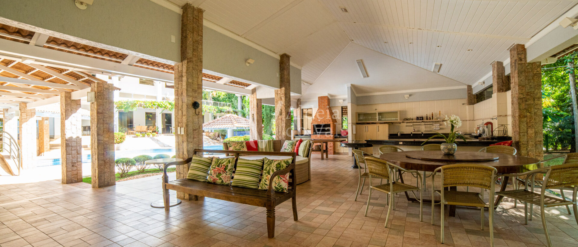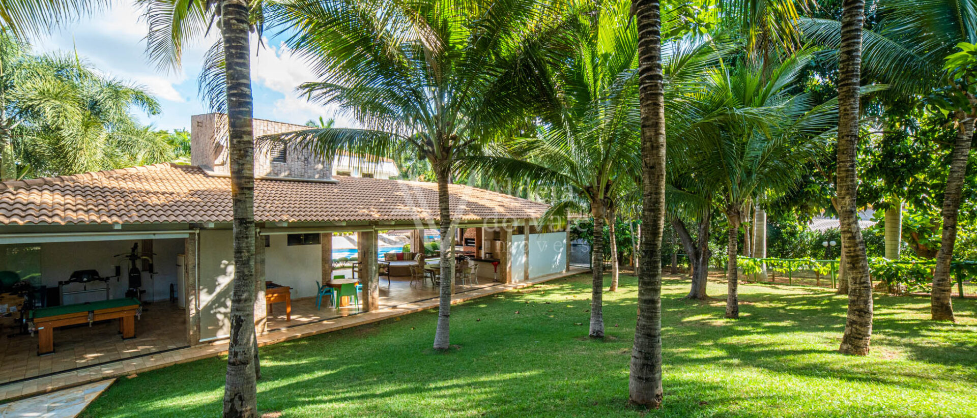 Área de lazer exuberante com piscina em formato personalizado, pergolado, bar molhado, espaço gourmet com cozinha, balcão frigorífico, bancada em granito, dois banheiros, sauna, sala de jogos, escaninho.
