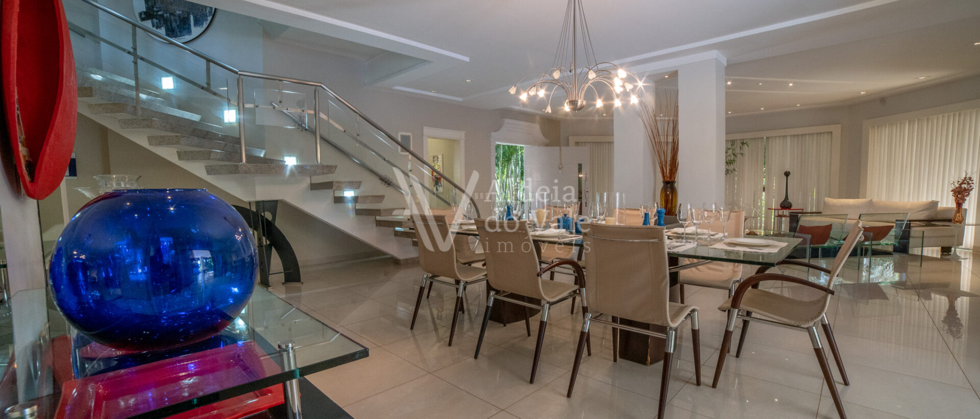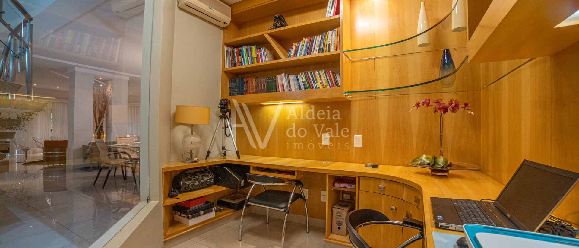 No piso térreo oferece uma sala ampla, lavabo, escritório, home, varanda contornando a casa, cozinha, área de serviço e uma suíte.