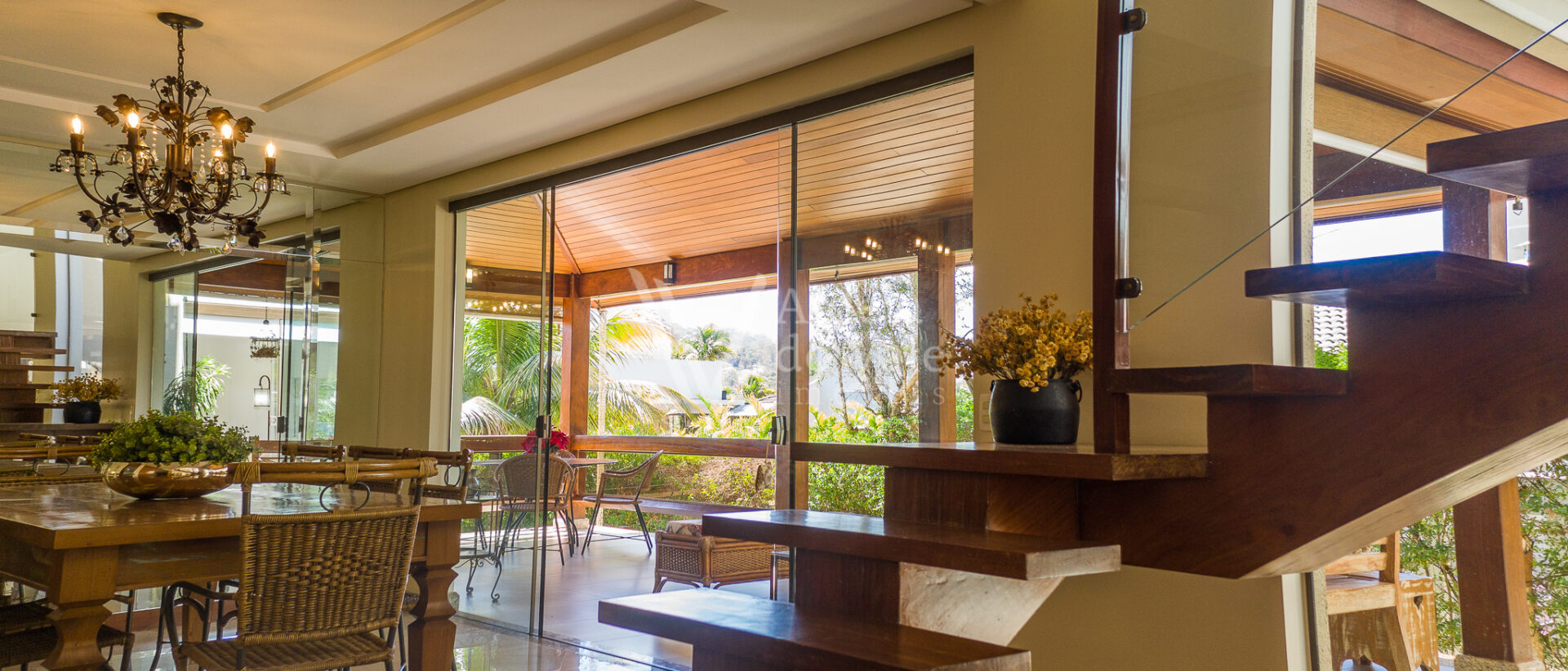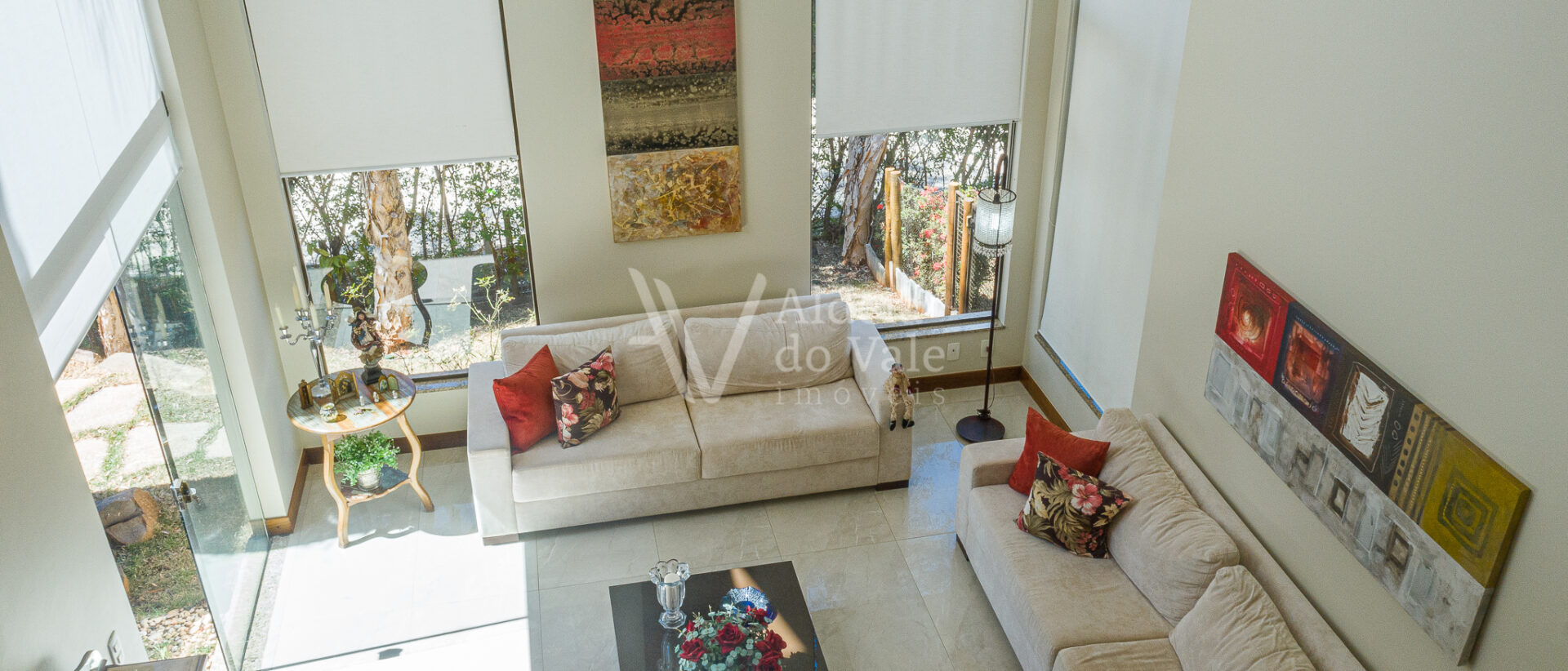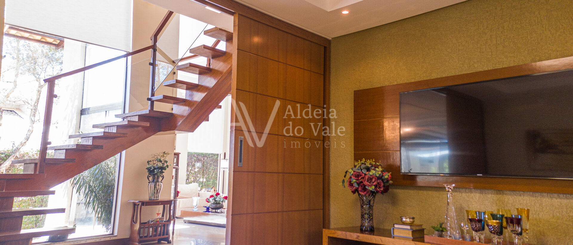 A sala de estar é ampla e arejada com pé direito duplo. São 4 suítes sendo uma no térreo. As 3 suítes superiores estão completas em armários e são duas suítes másters com closets.
