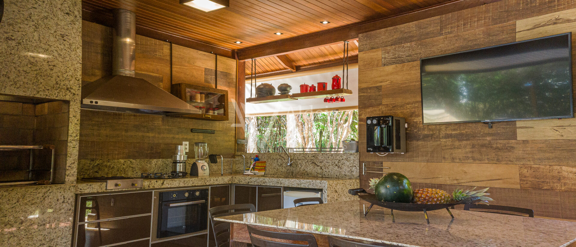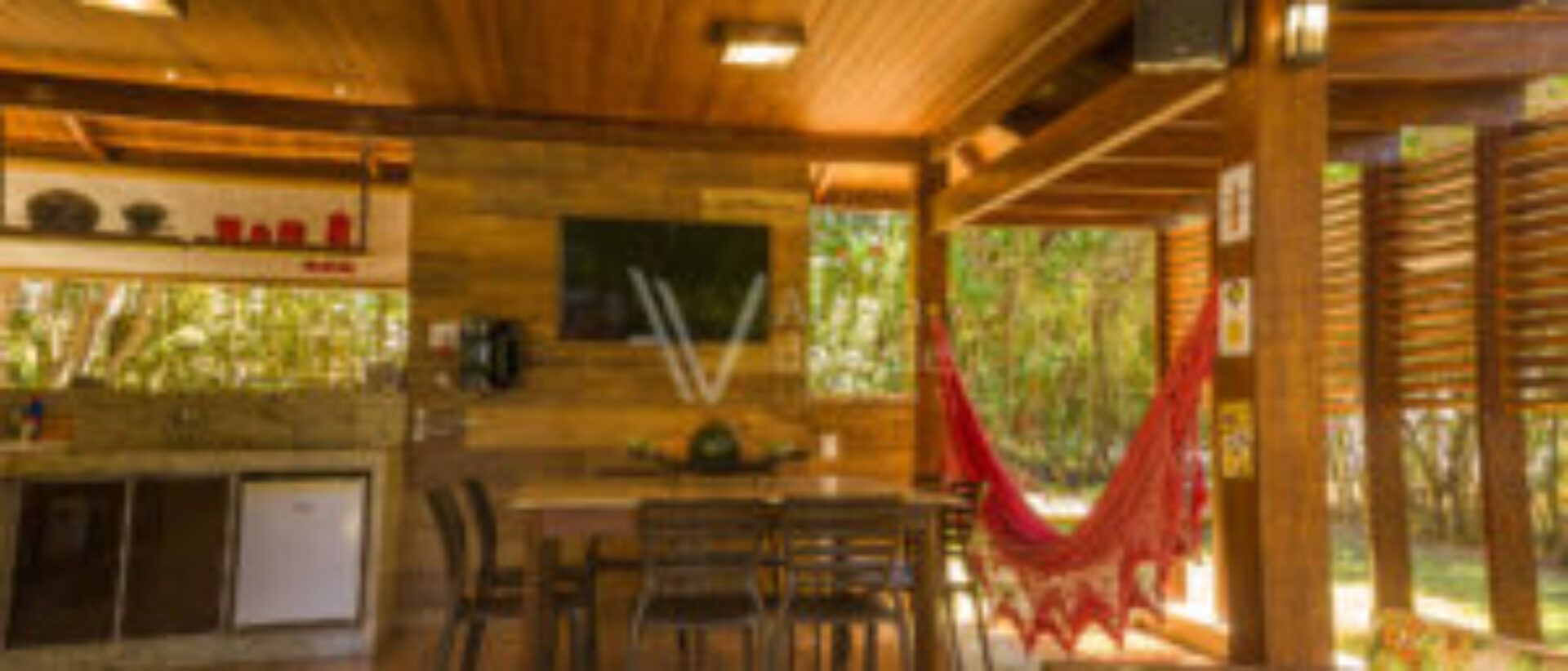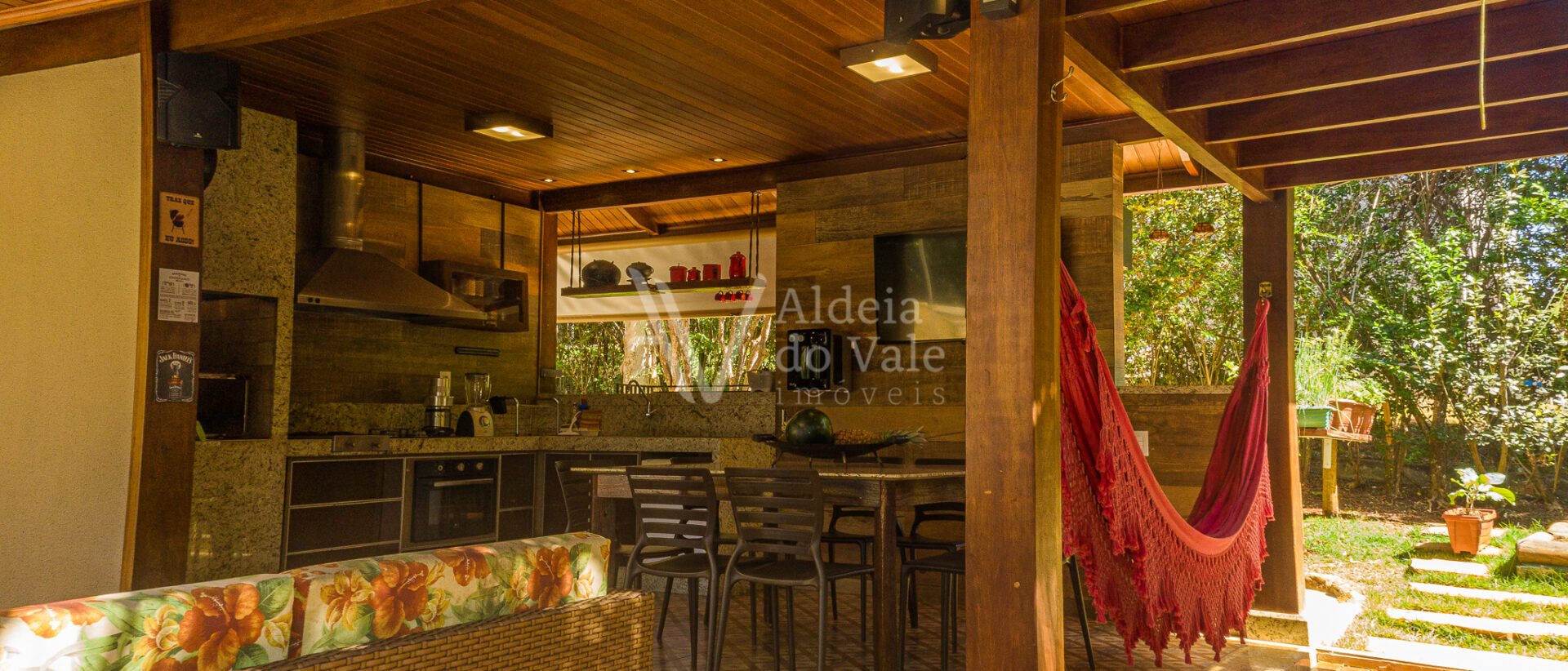 Ao entrar nesse sobrado tão bem decorado, com tanto carinho, bom gosto e cuidado, bate uma vontade de experimentar morar aqui. Cada ambiente é um verdadeiro recanto. Para os amantes da boa culinária tem uma área gourmet na varanda integrada à cozinha que é perfeita para cozinhar apreciando o belíssimo pôr de sol no final de tarde, tem o quiosque maravilhoso com boca de fogão industrial, escorredor projetado para panelas grandes e com lugar especial para pendurar os discos de roda de fritar bifes, tudo sob medida e com a boa e companheira rede pra tirar um cochilo depois do almoço de final de semana.