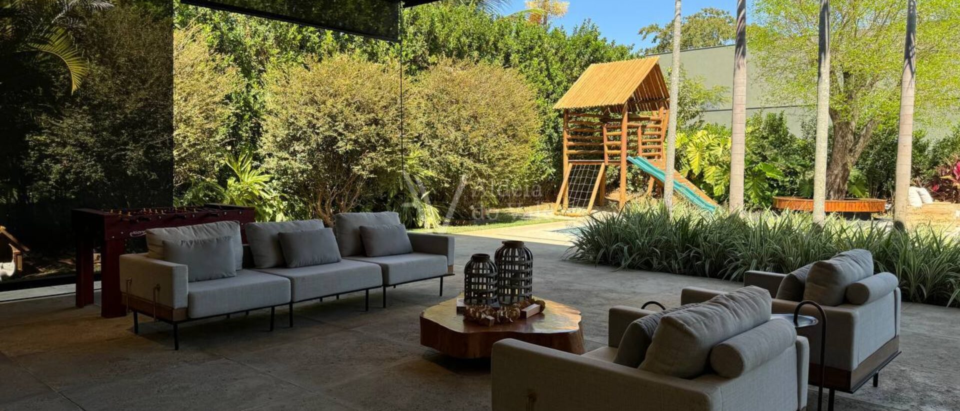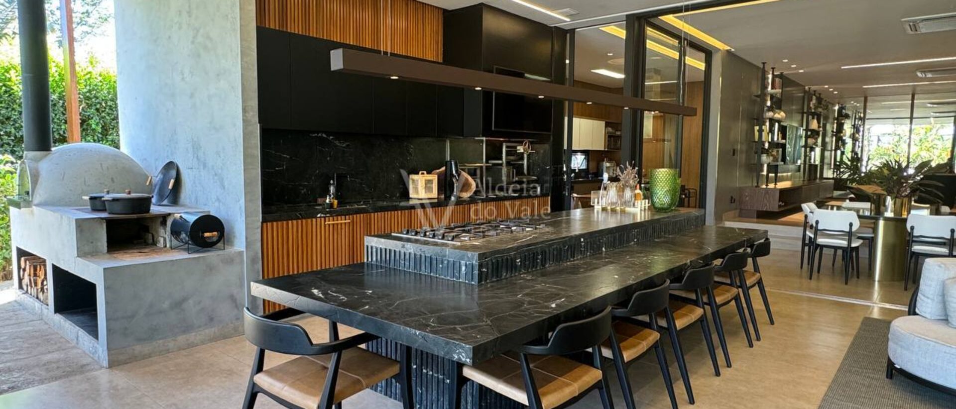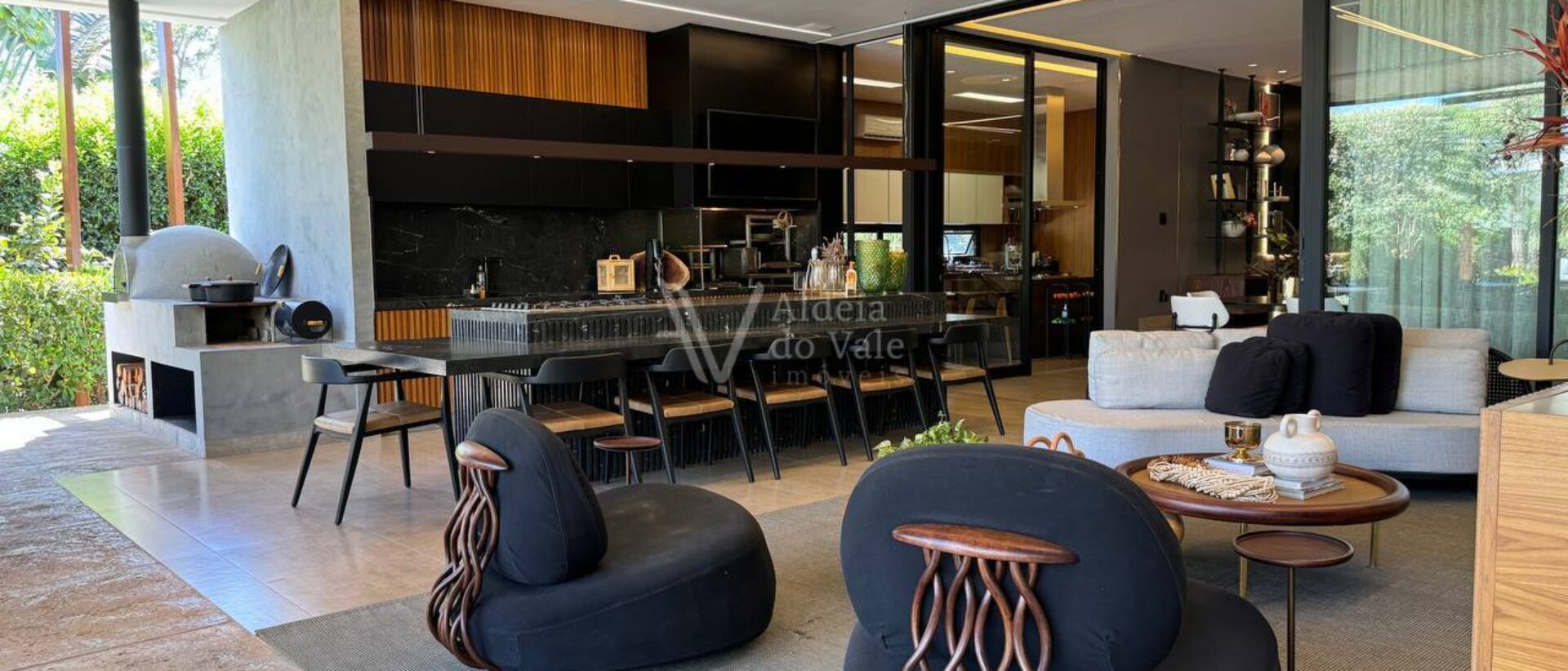 Possui 3 suítes e um escritório com banheiro, sala ampla, cozinha completa, área de lazer com churrasqueira e forno a lenha, e parquinho com piso amortecedor.