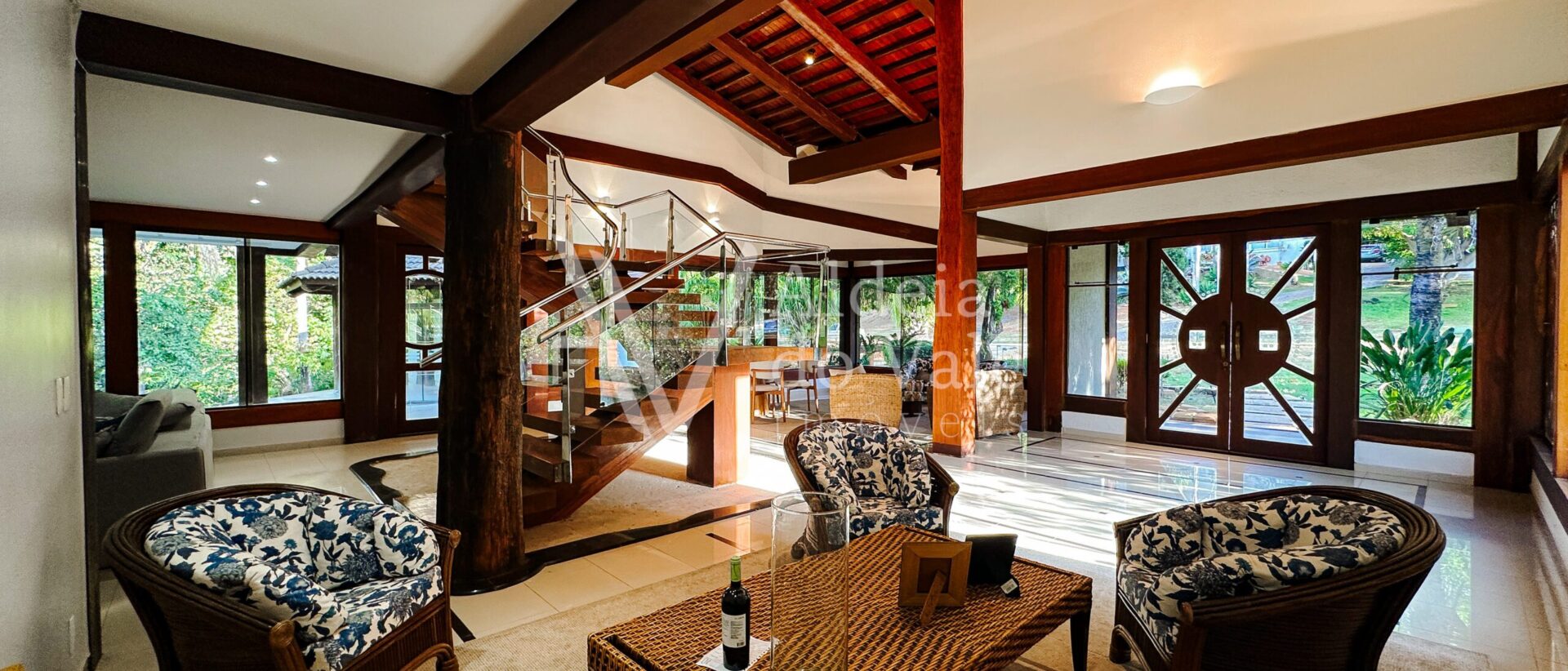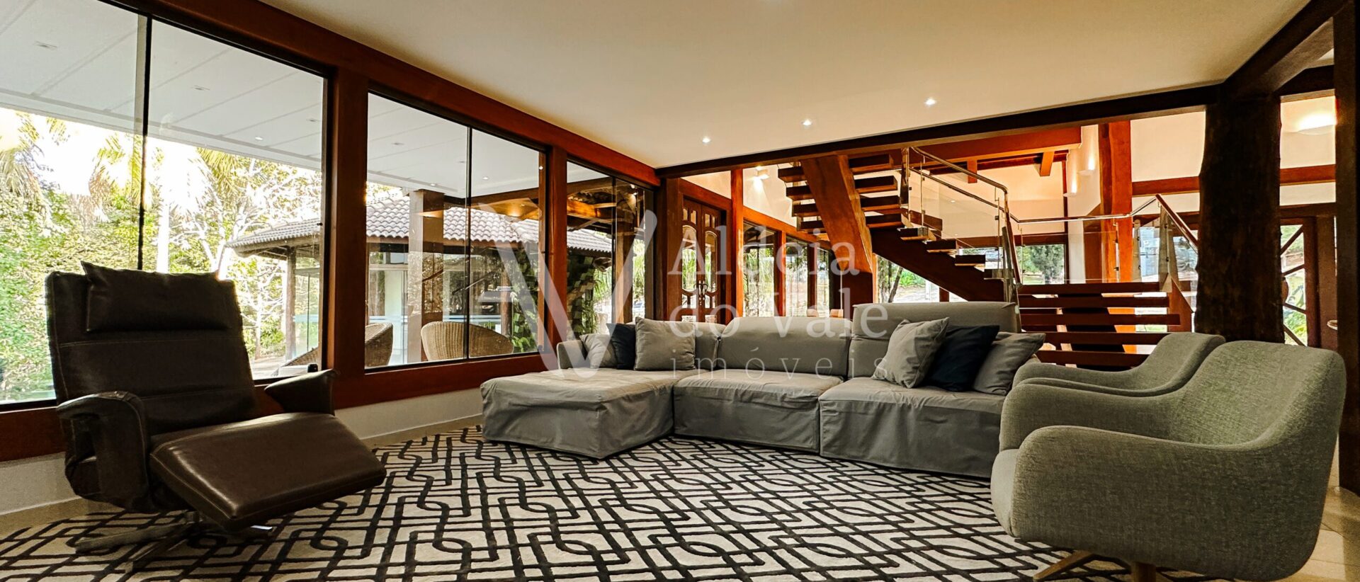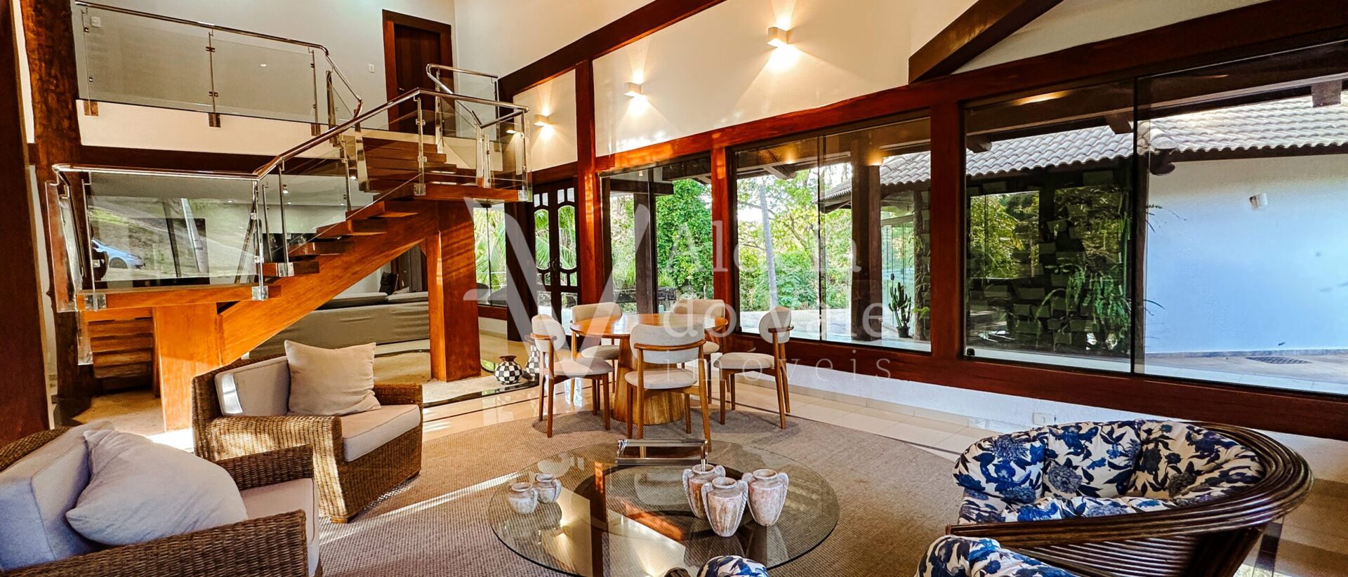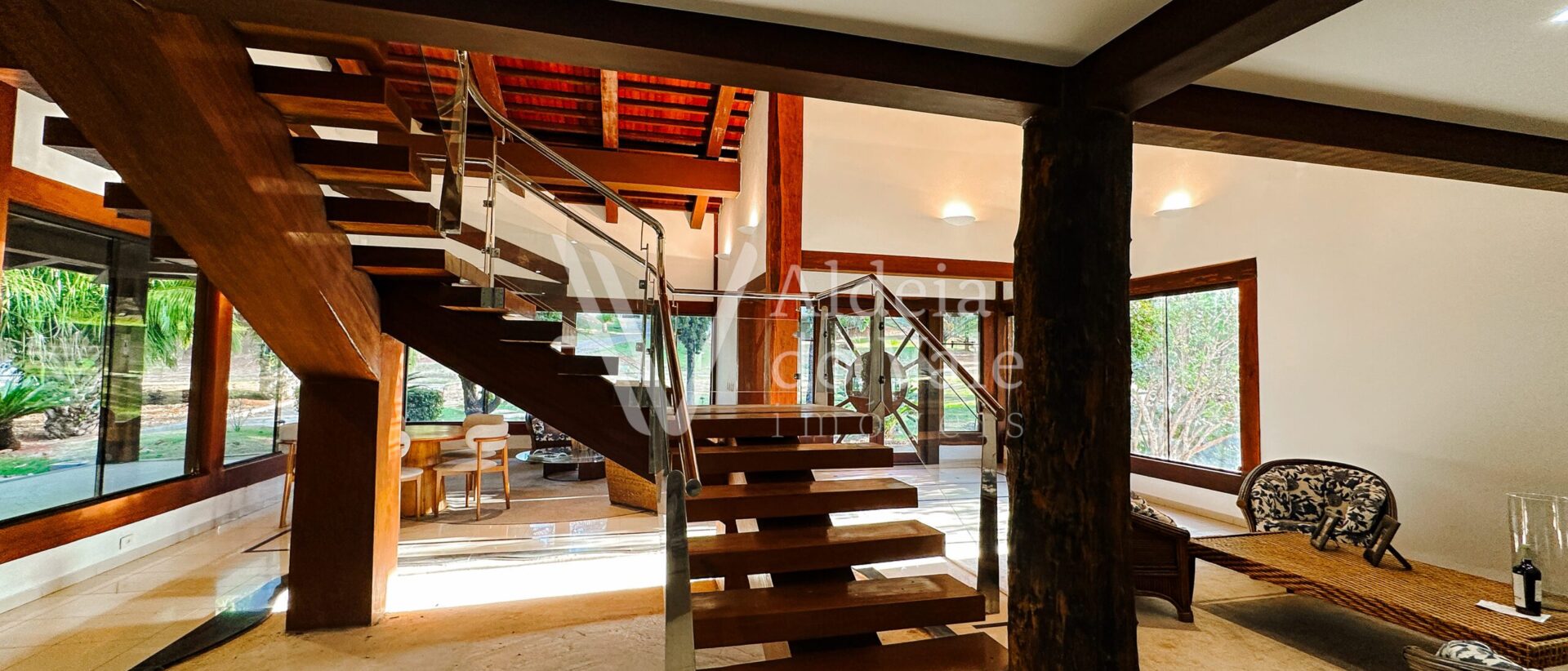 Com madeira, no estilo rústico, super aconchegante, possui uma sala lindíssima, muito bem iluminada, com pé-direito duplo.