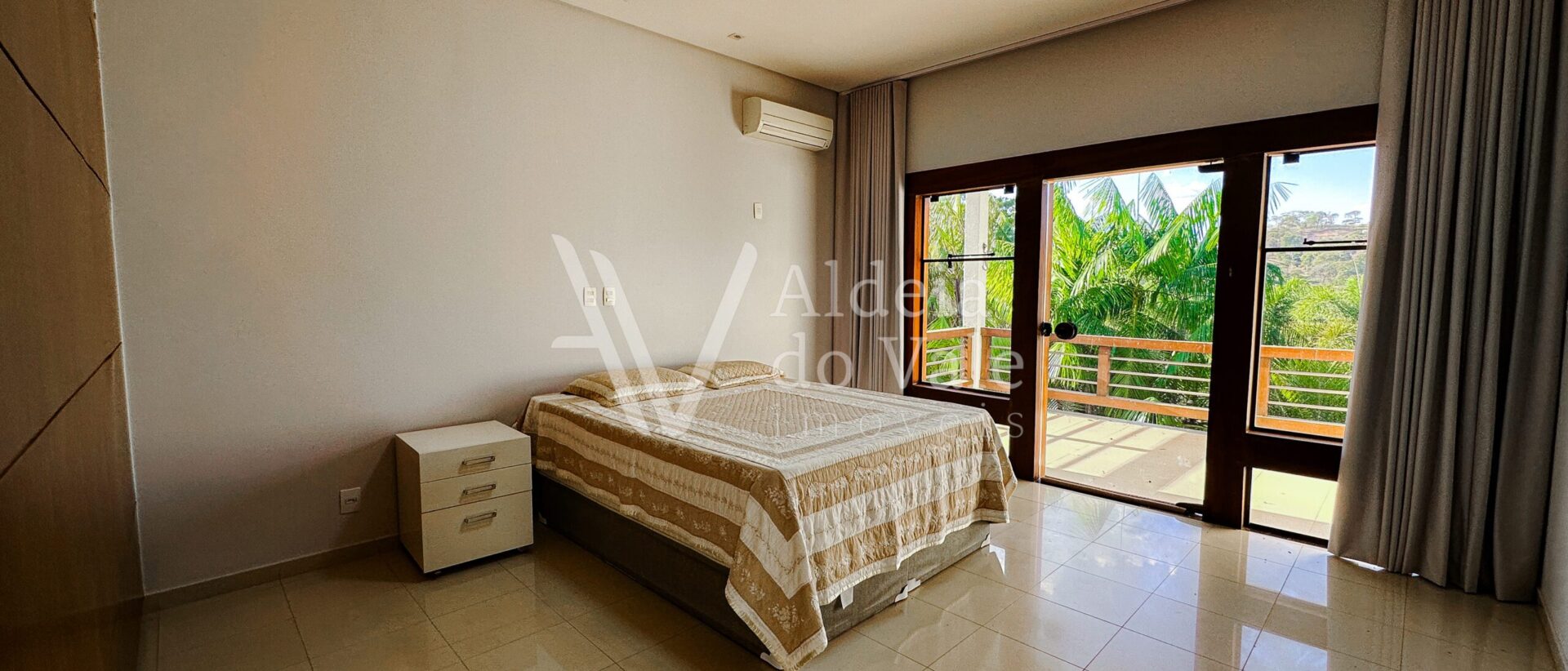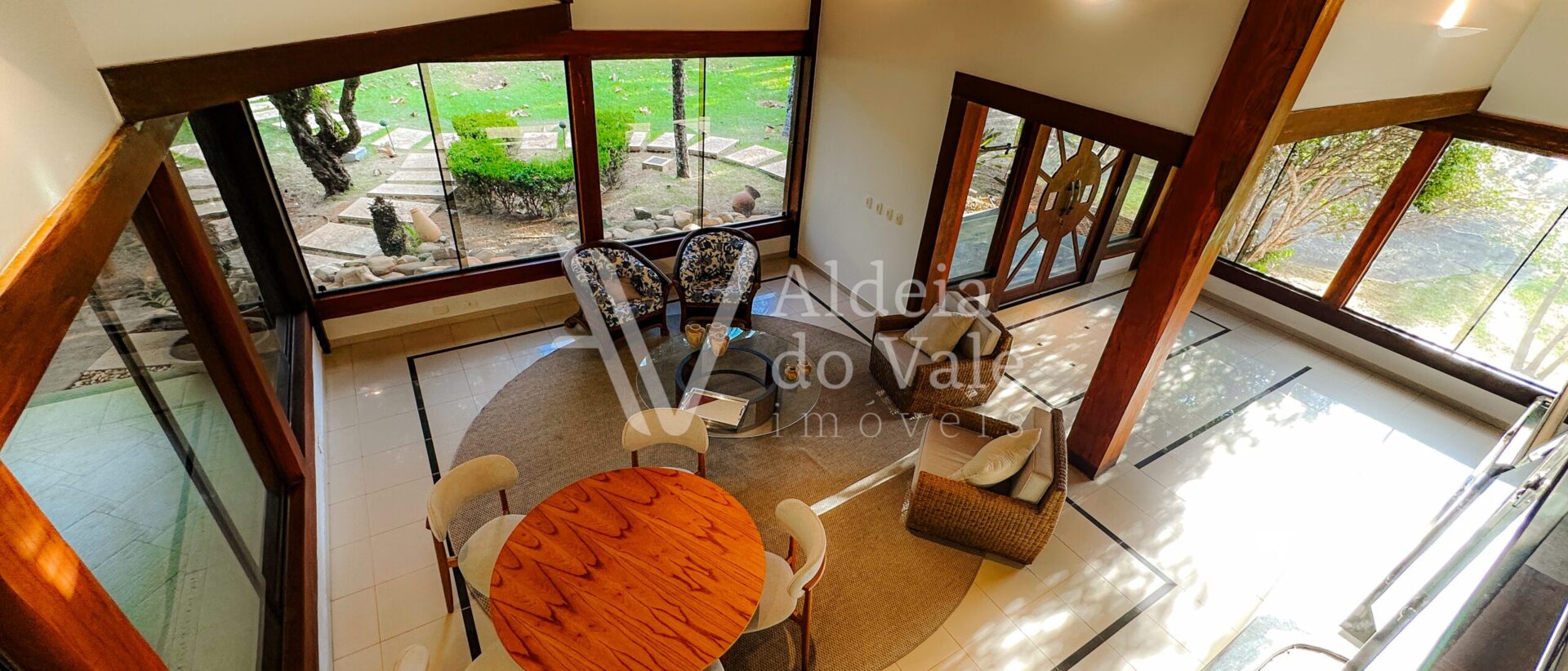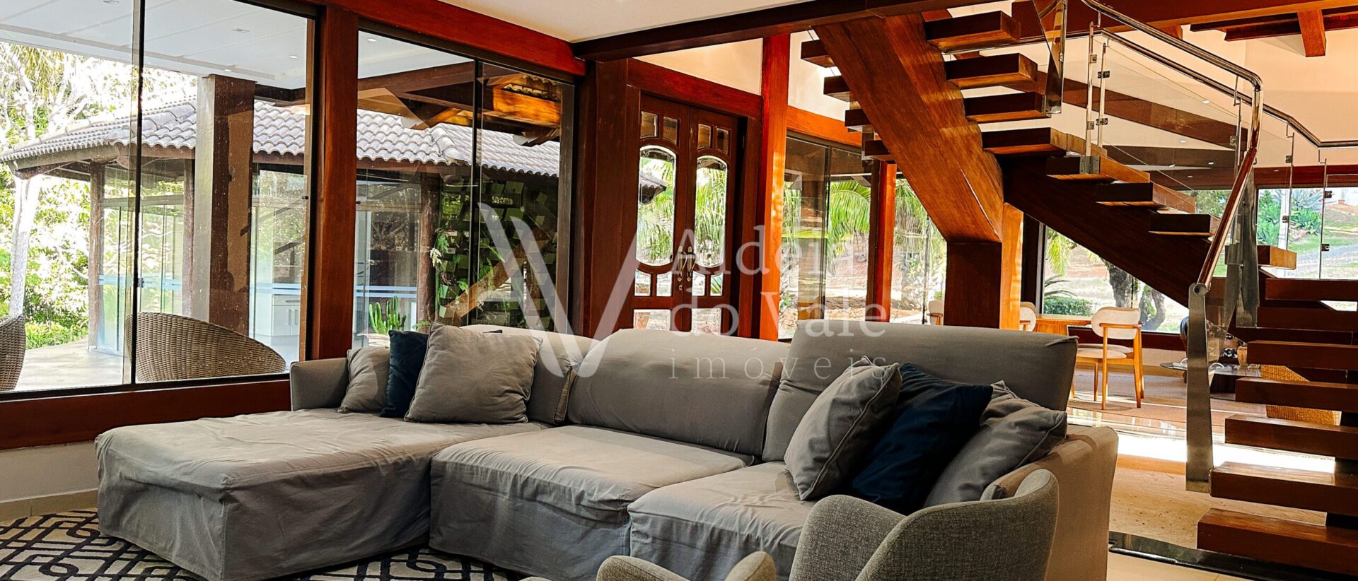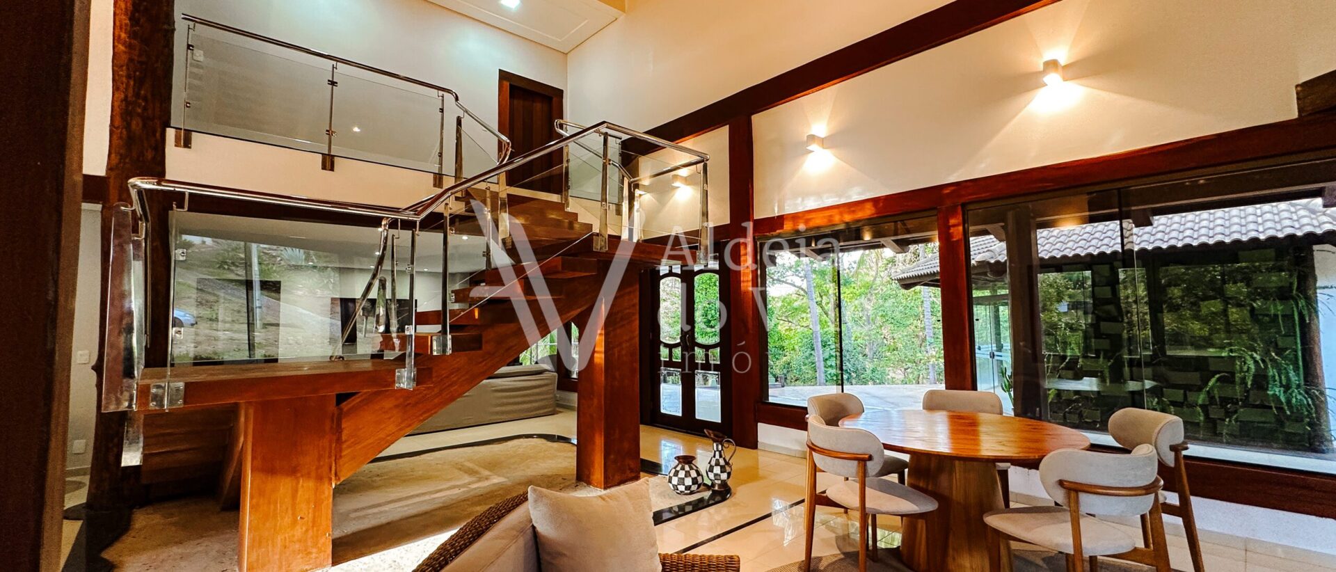Com madeira, no estilo rústico, super aconchegante, possui uma sala lindíssima, muito bem iluminada, com pé-direito duplo.