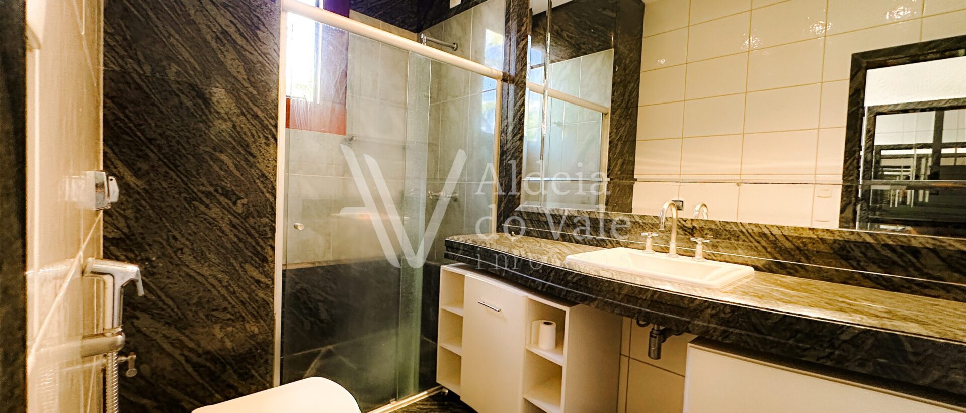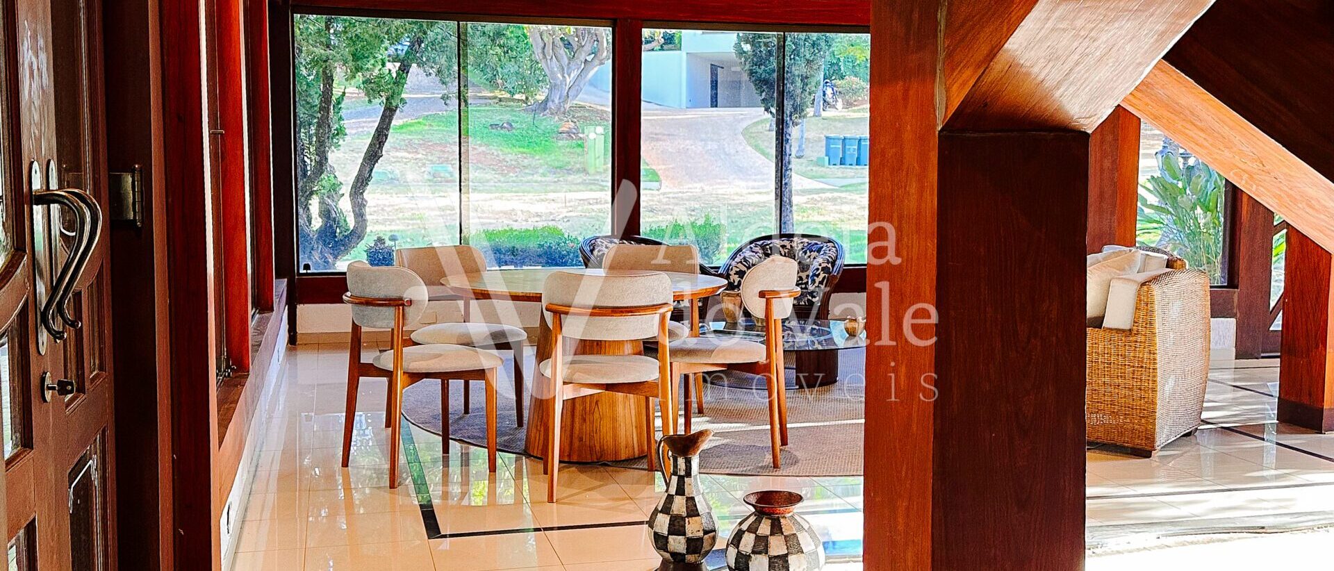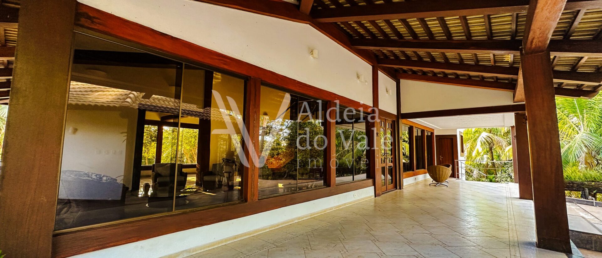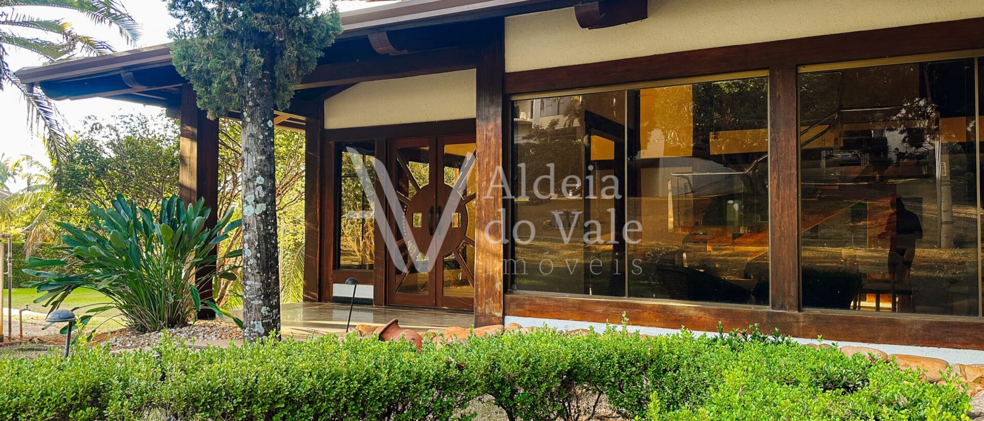 Com madeira, no estilo rústico, super aconchegante, possui uma sala lindíssima, muito bem iluminada, com pé-direito duplo.