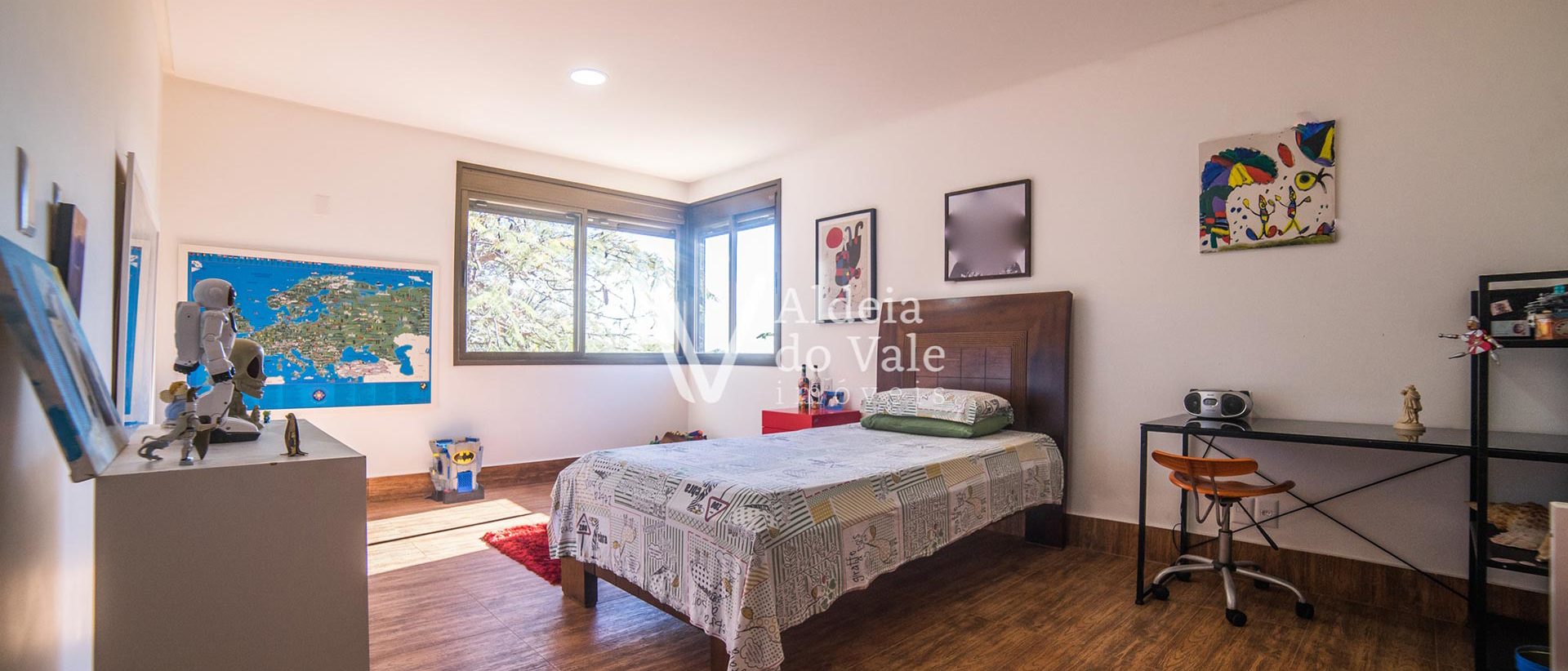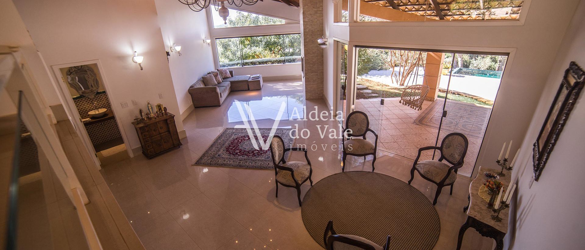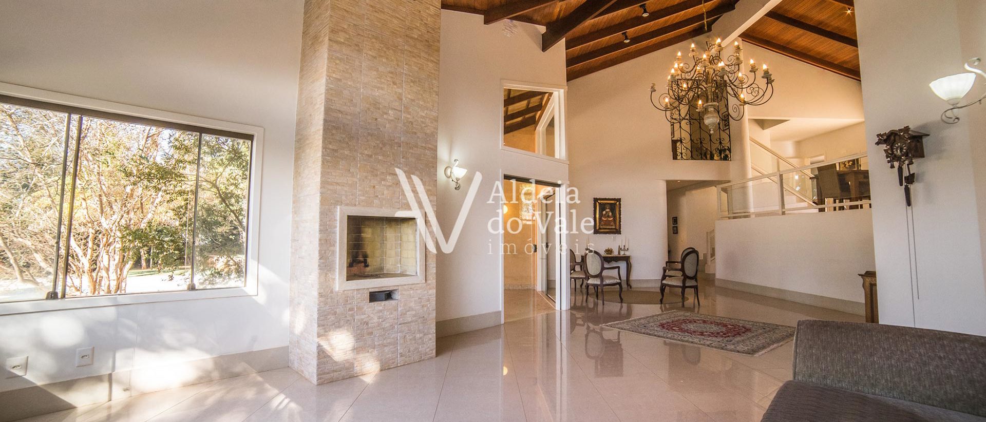Salas amplas com lareira e um pé direito duplo com lambril de madeira. Sala de TV, cozinha gourmet, sauna e um ambiente versátil para brinquedoteca, sala de ginástica ou atelier.