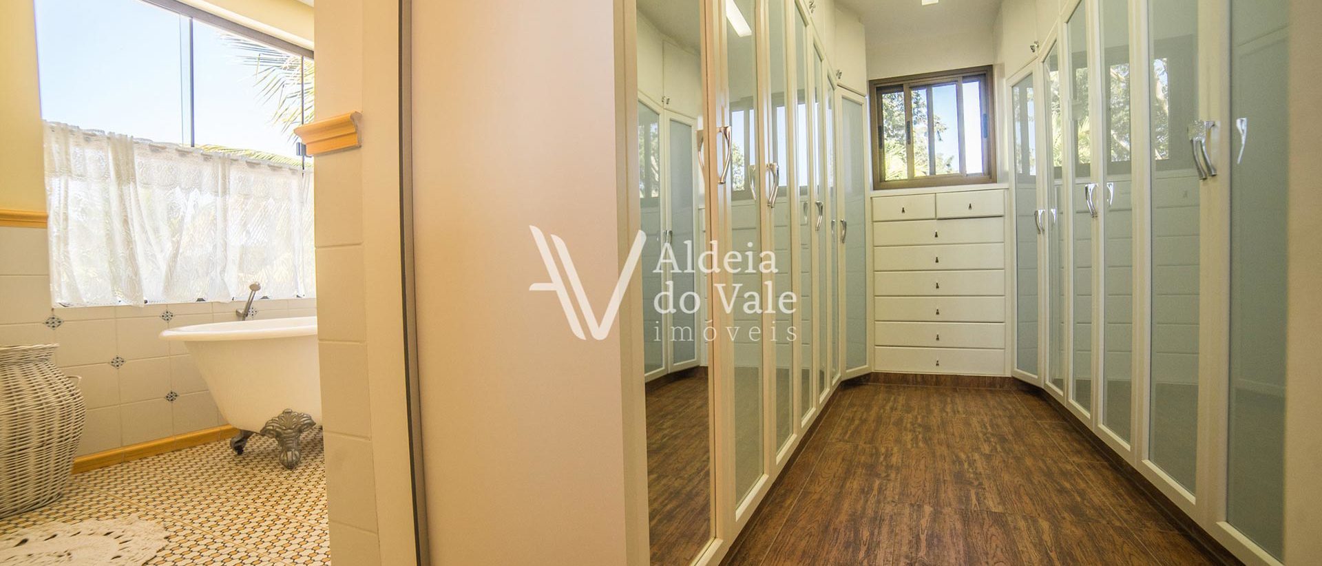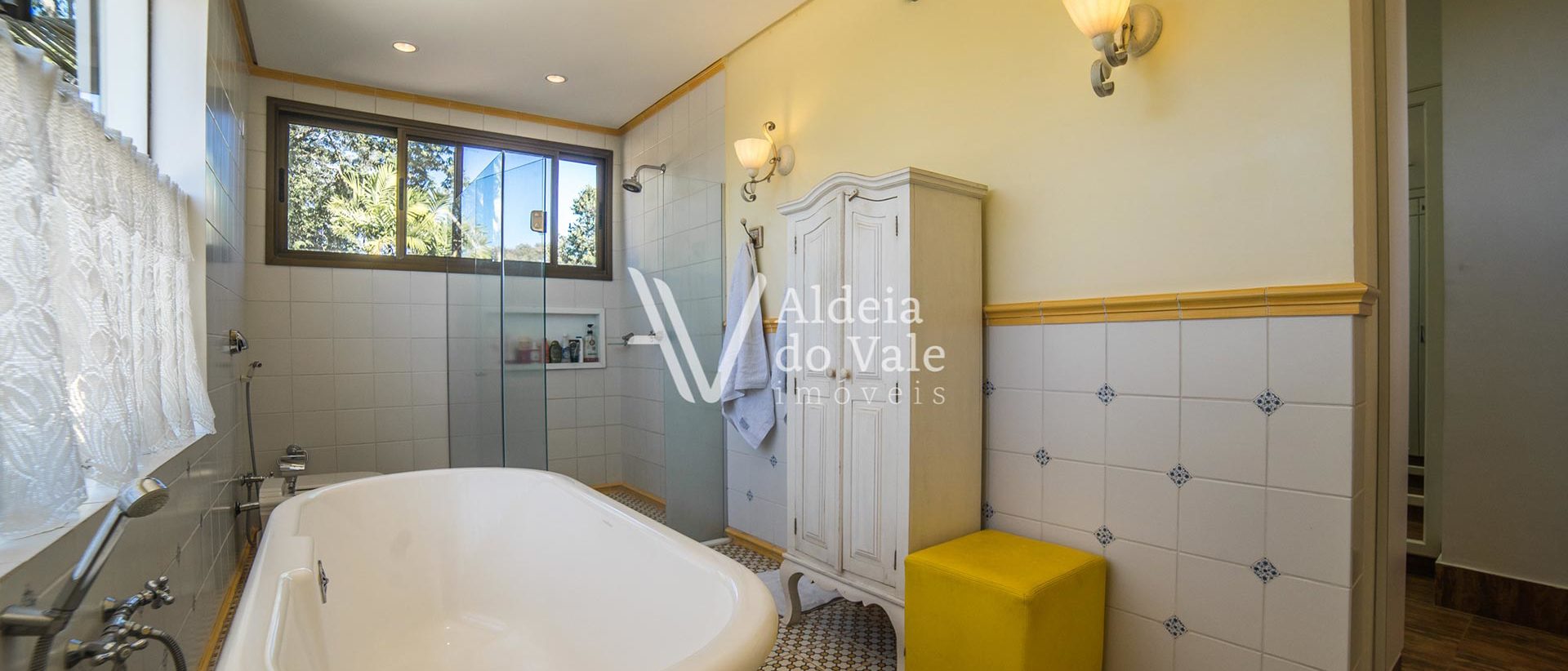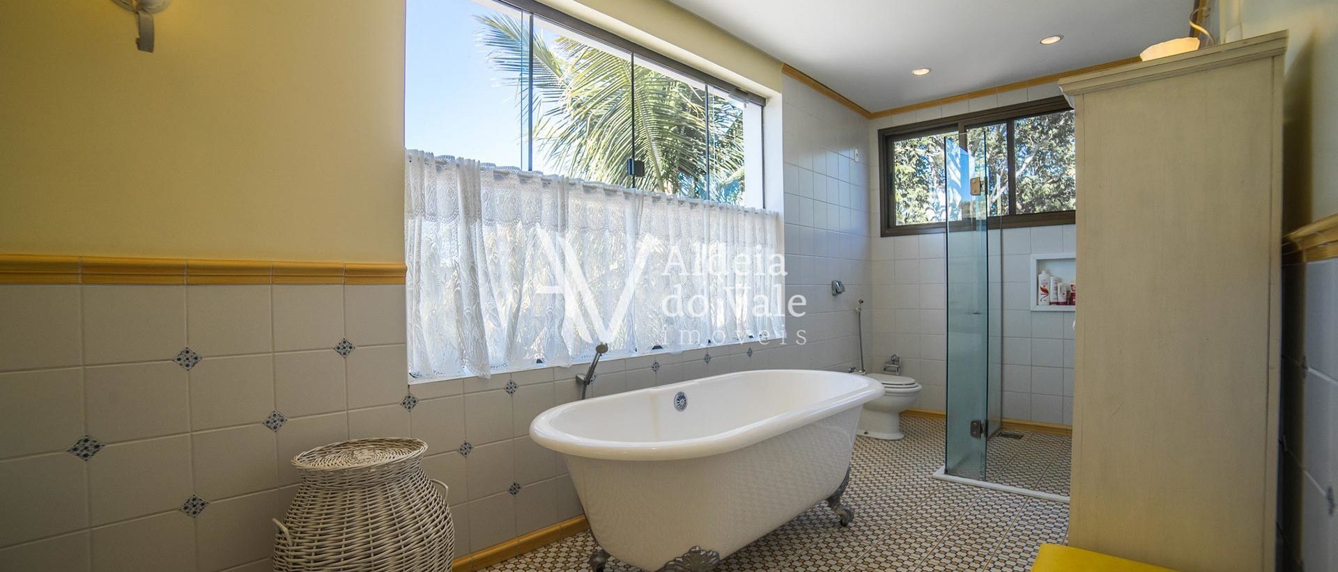 Janelas com venezianas e banheira vitoriana na suíte do casal.