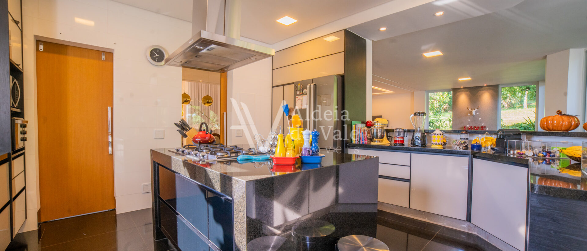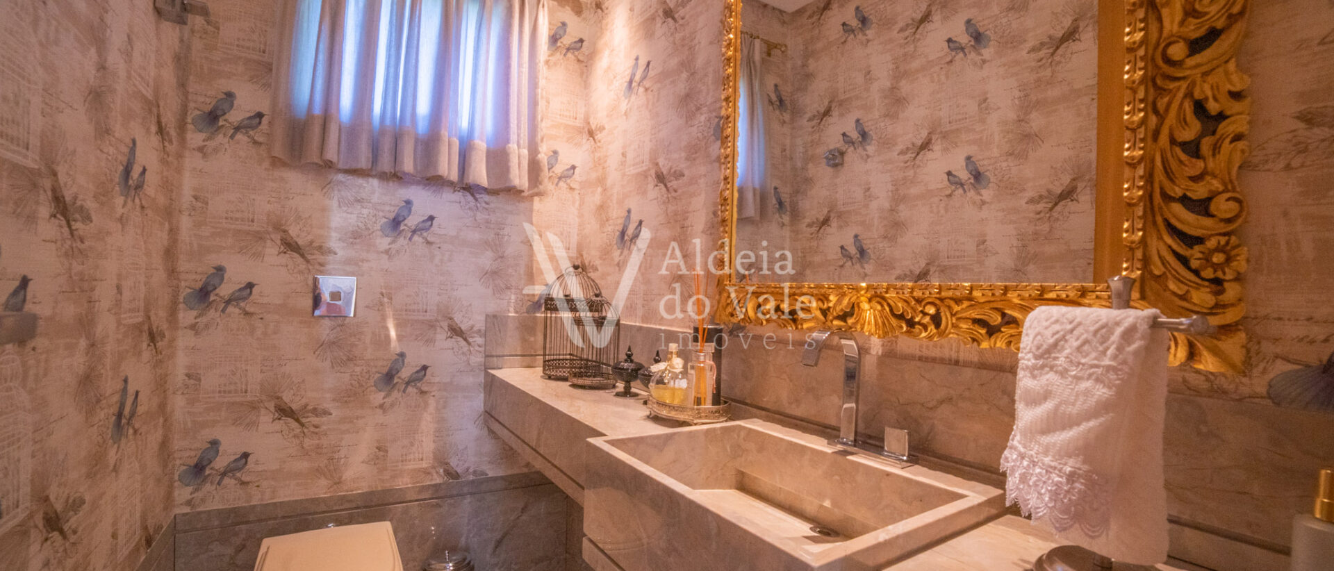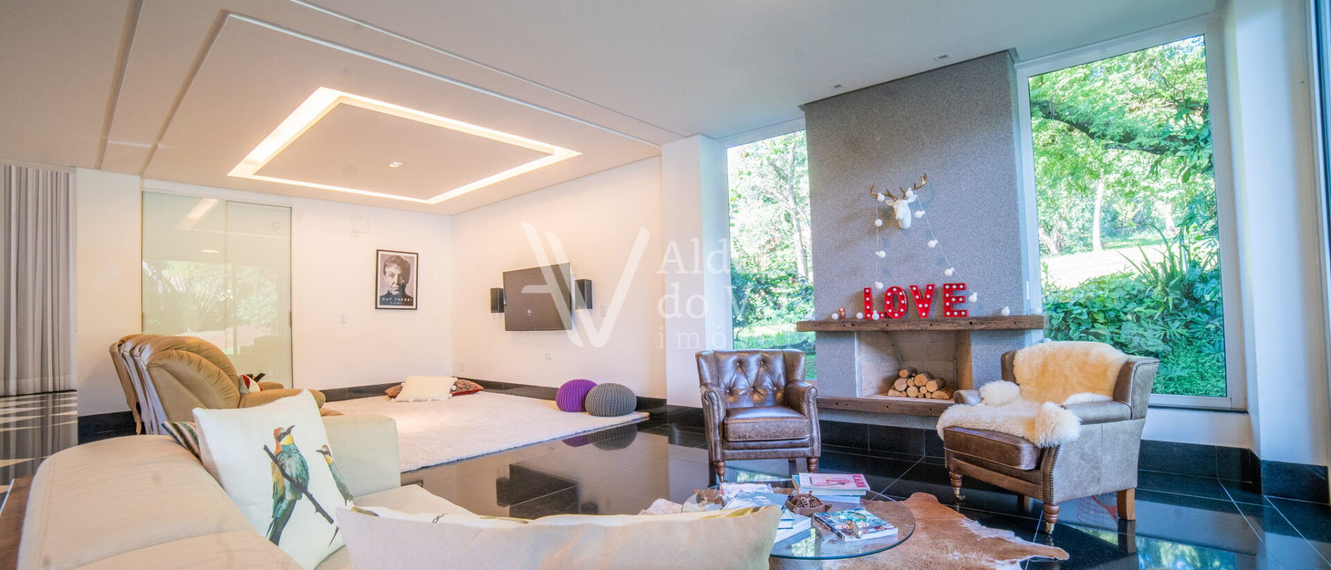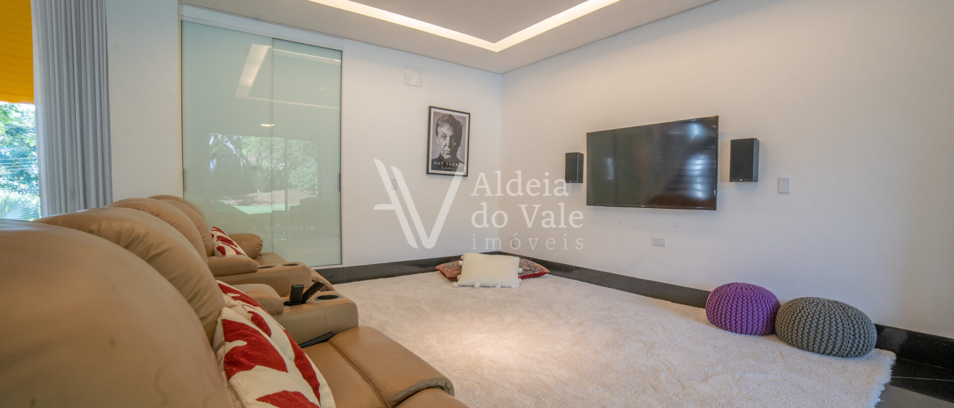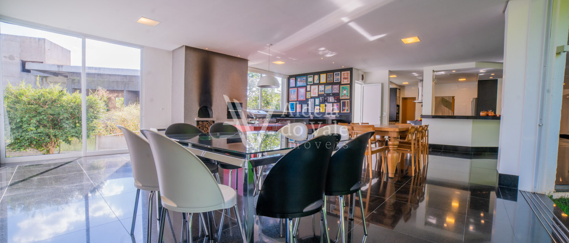 Possui 3 suítes com closet no piso superior, sendo uma máster completíssima em armários. No piso térreo mais uma suíte, escritório, lavabo, e sala de estar com pé direito duplo, sala de jantar, Home Theater com lareira, varanda ampla e jardim, cozinha gourmet maravilhosa com despensa.