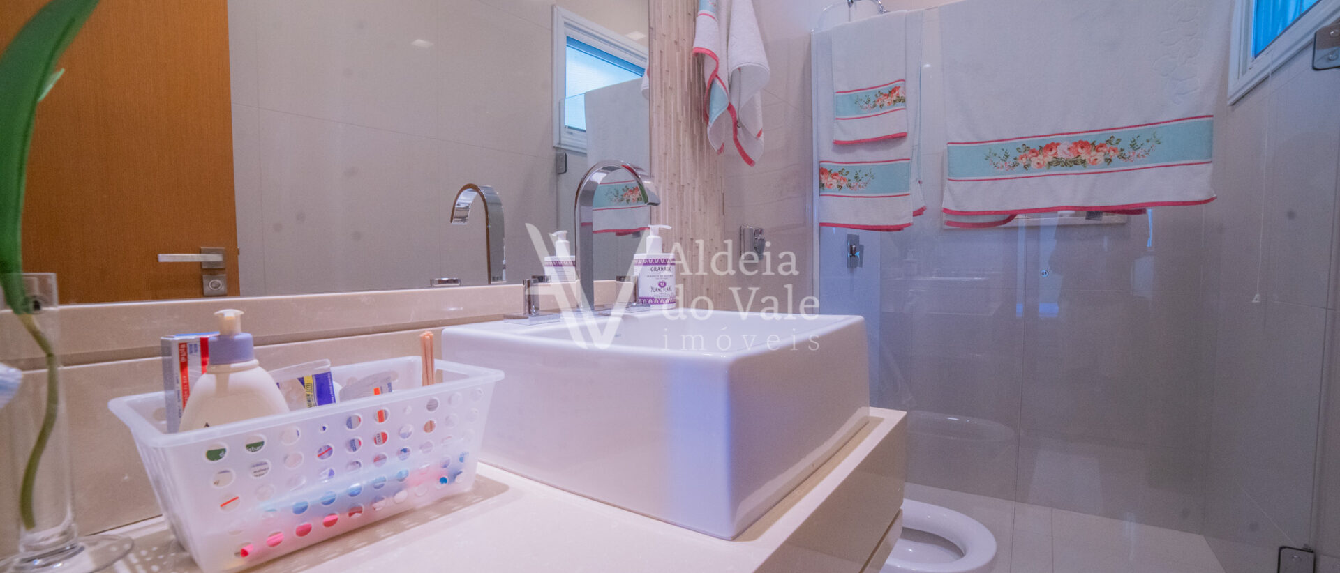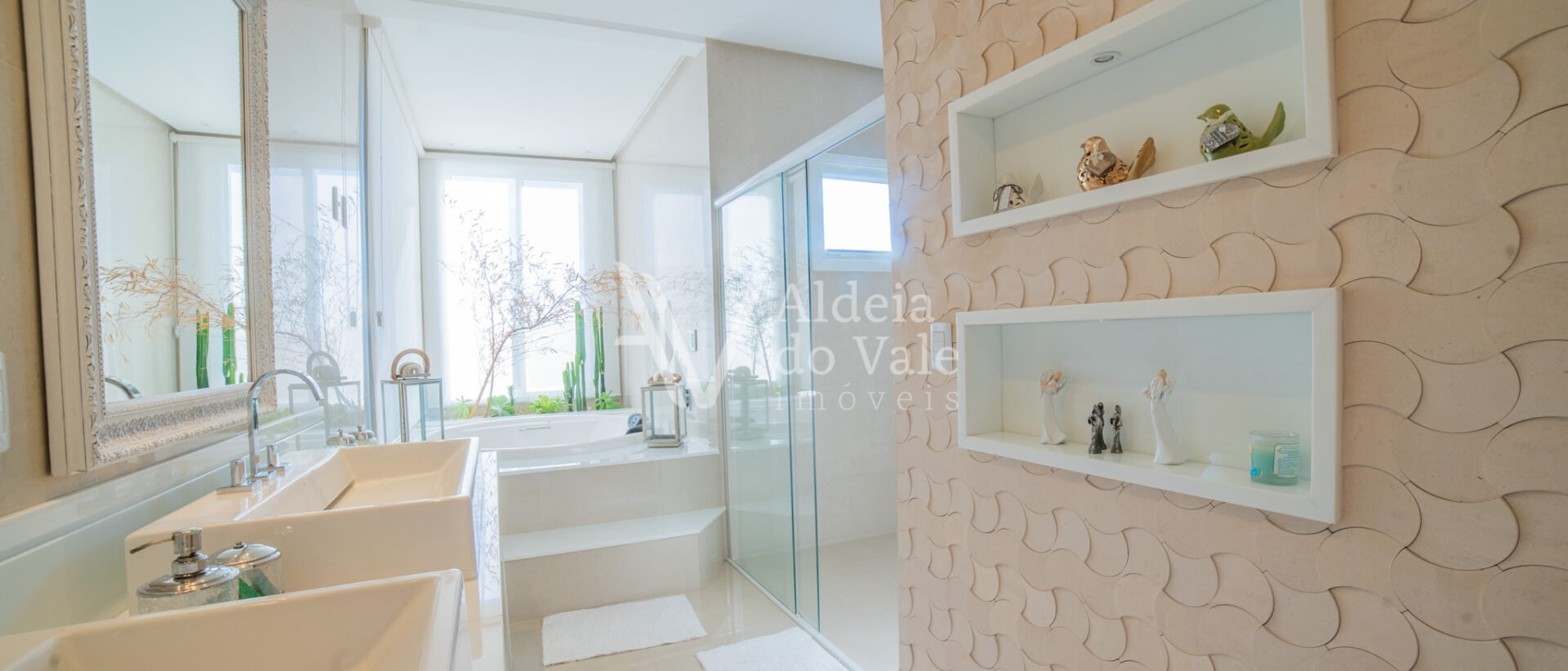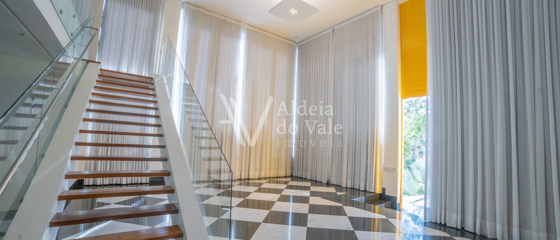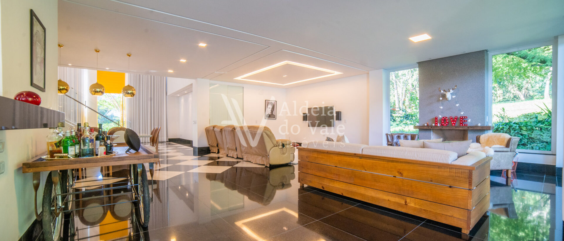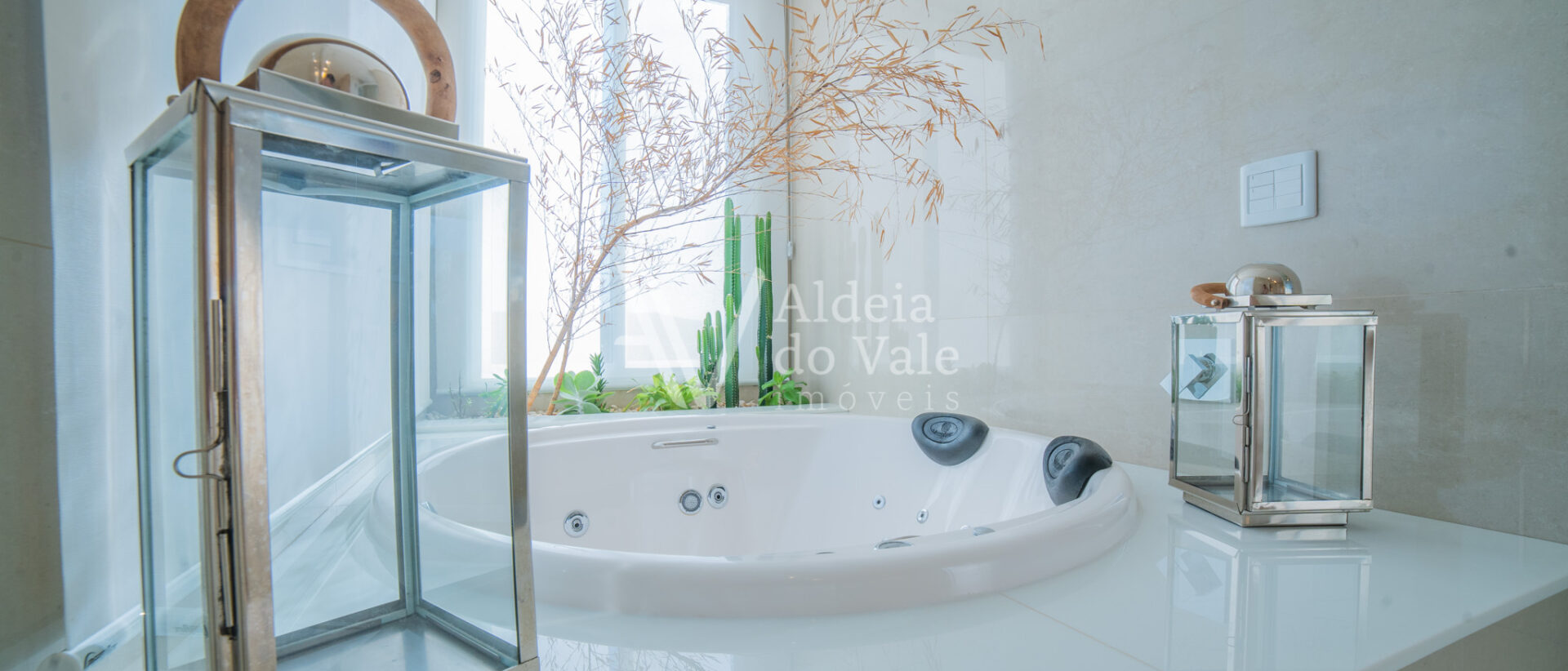 Possui 3 suítes com closet no piso superior, sendo uma máster completíssima em armários. No piso térreo mais uma suíte, escritório, lavabo, e sala de estar com pé direito duplo, sala de jantar, Home Theater com lareira, varanda ampla e jardim, cozinha gourmet maravilhosa com despensa.
