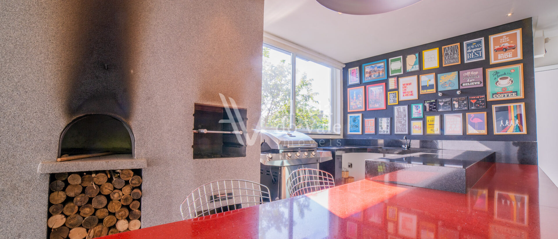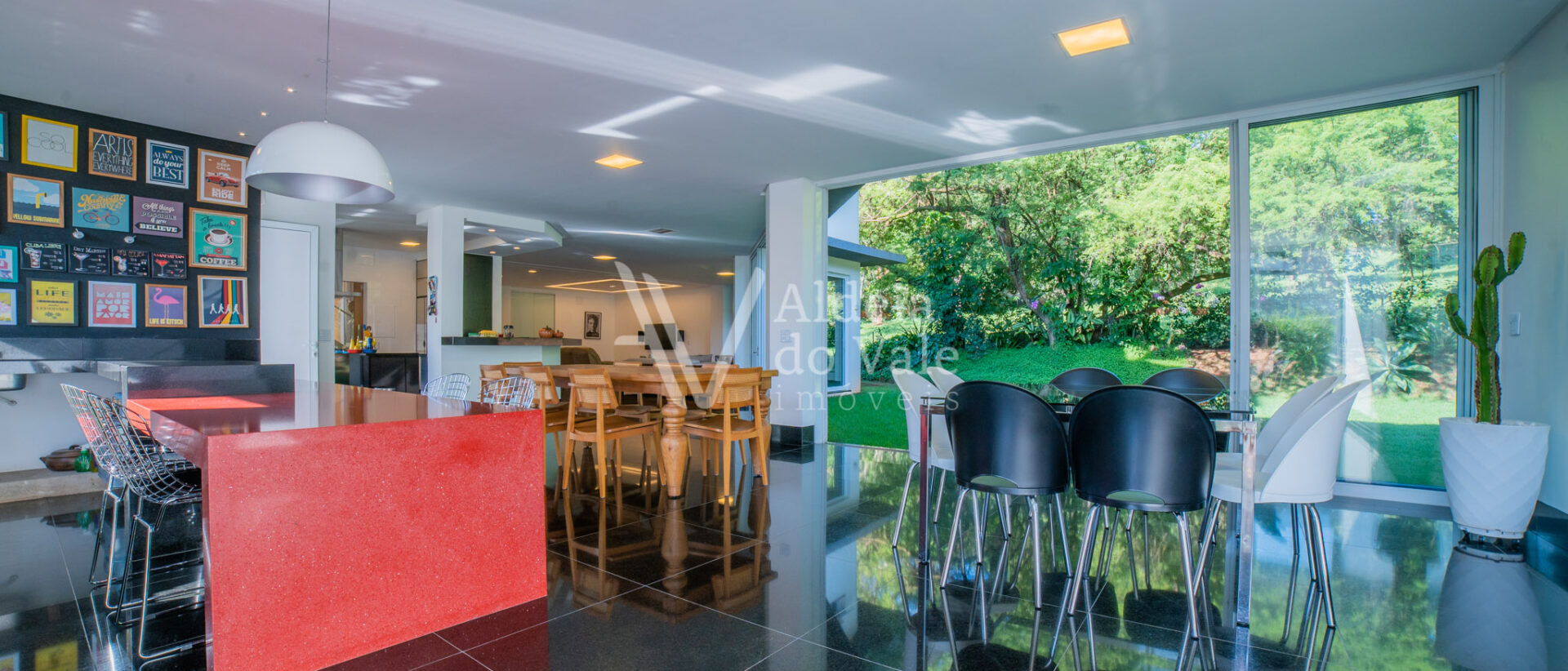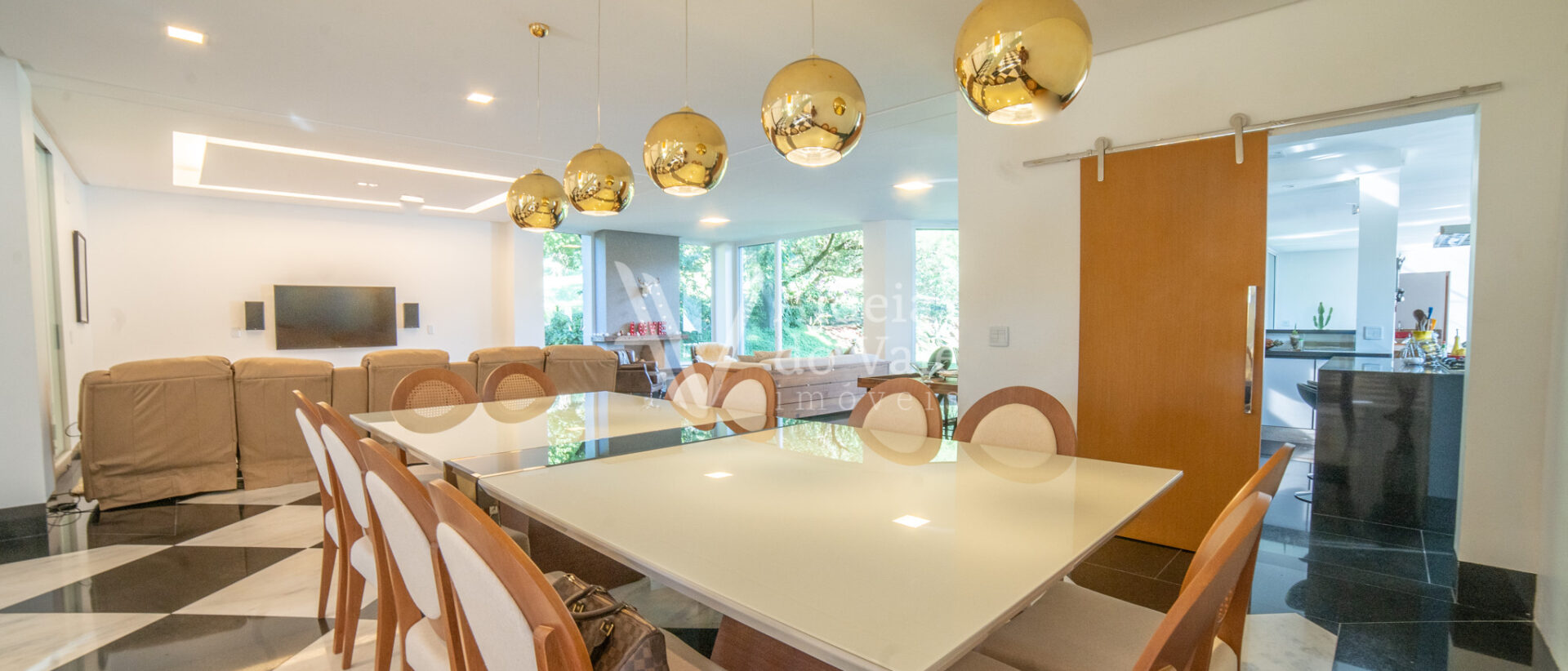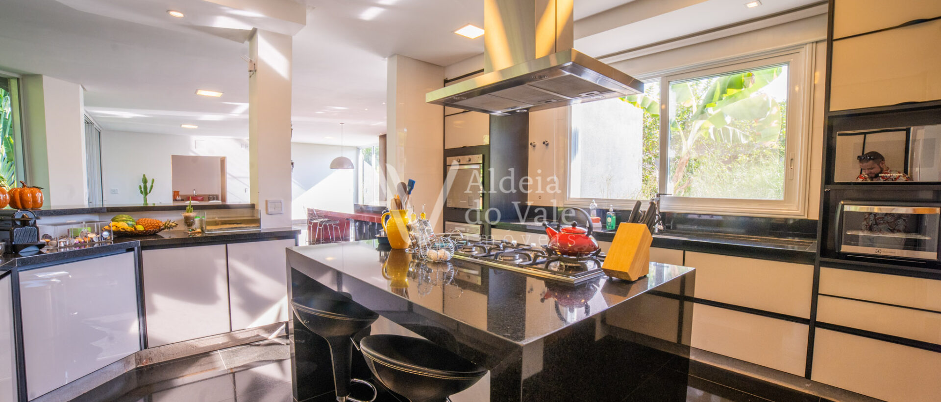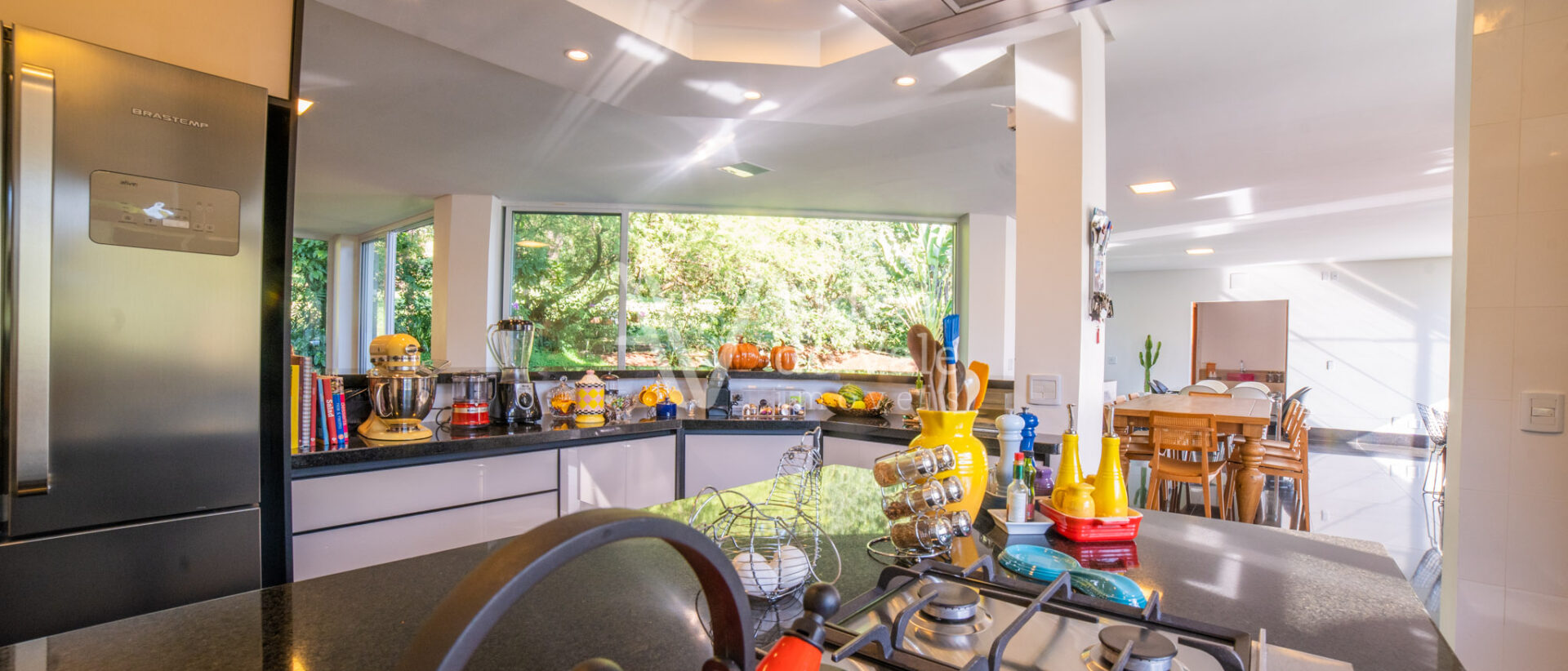 O point central é na cozinha que é integrada com a área Gourmet, que possui uma bela piscina, churrasqueira e forno de pizza pra confraternizar, cercada das salas versáteis que se integram na área externa trazendo a natureza para dentro da casa.