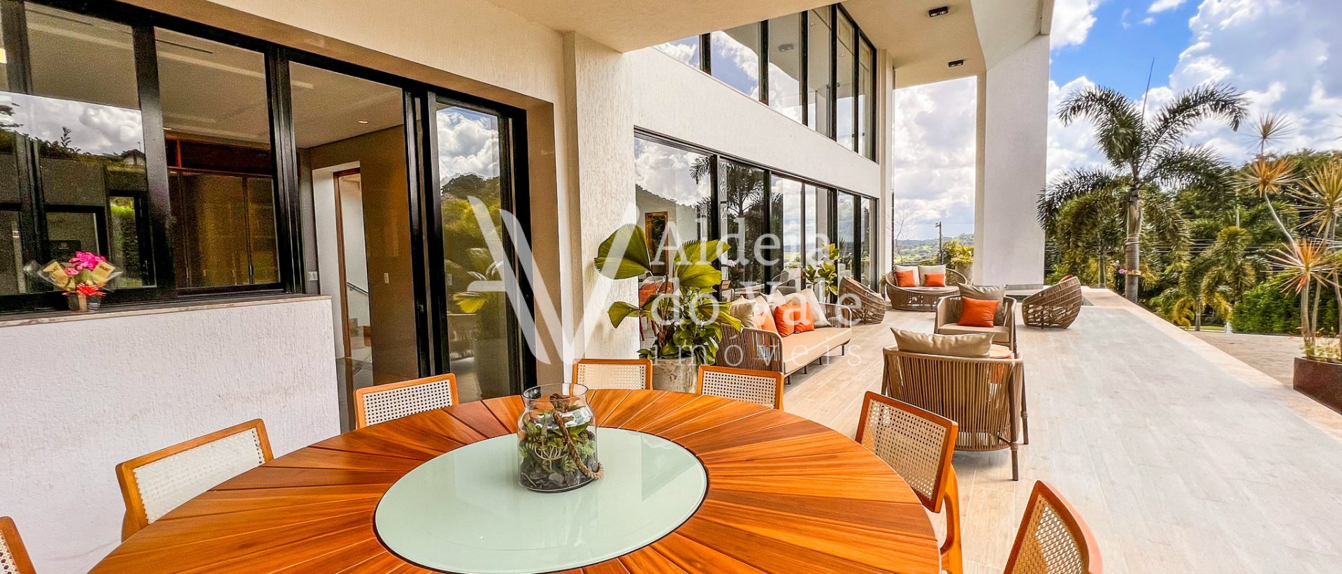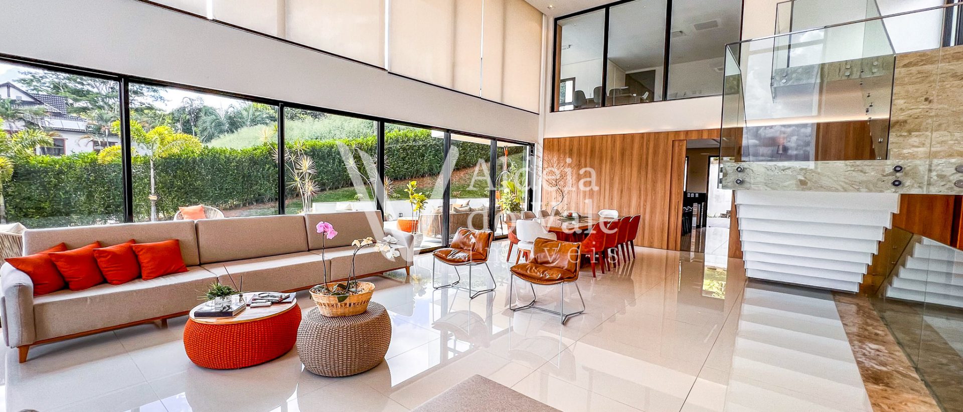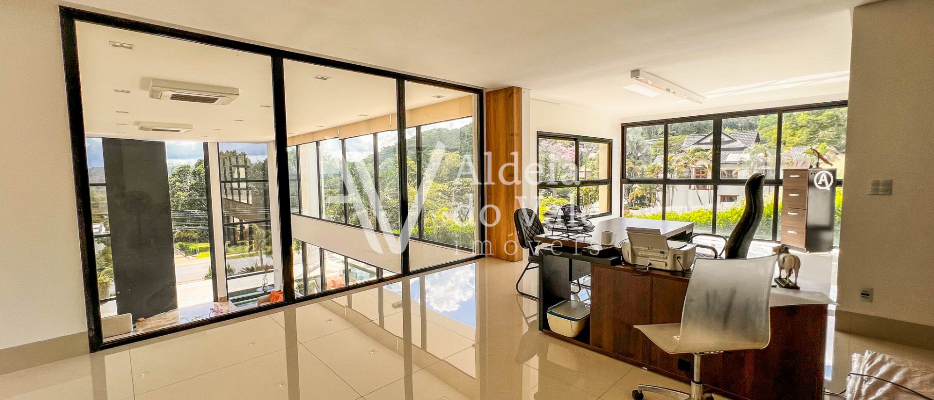 Possui sala ampla e climatizada para até 3 ambientes com pé direito alto, porta principal da sala pivotante em alumínio, portas em esquadrias de alumínio de correr nas laterais da sala com persianas, com altura do pé direito, deixando o ambiente com bastante iluminação natural.